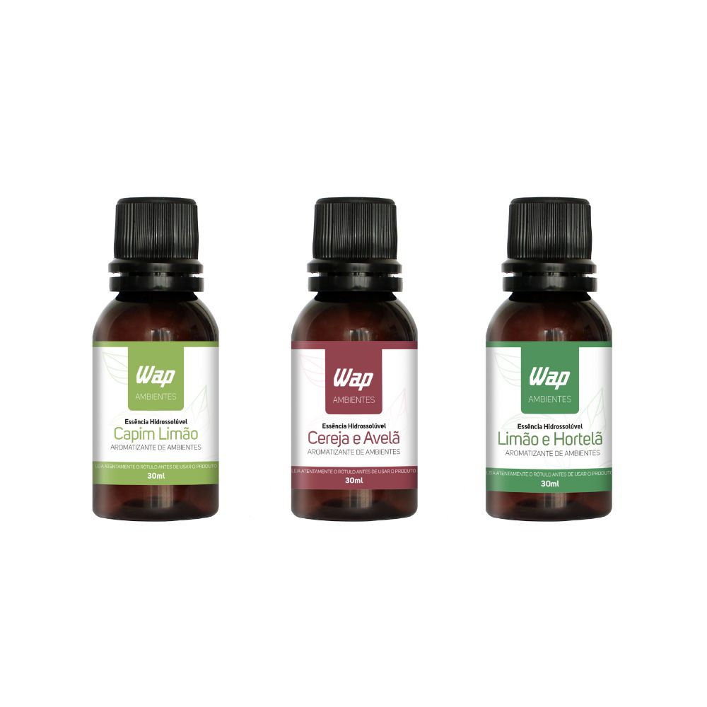 KIT ESSÊNCIA HIDROSSOLUVEL WAP (CEREJA E AVELÃ / CAPIM LIMÃO / LIMÃO E HORTELÃ)