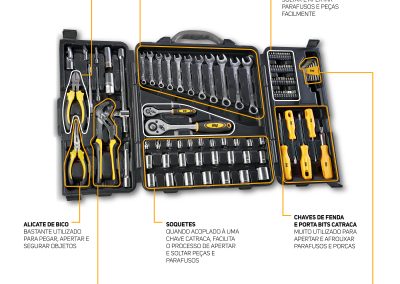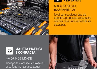 Feita para quem não abre mão de qualidade e praticidade no trabalho, a maleta do conjunto é compacta e resistente, com encaixe perfeito para os acessórios, para que eles estejam sempre ao seu alcance. Além de organizar o ambiente de trabalho, ela proporciona mobilidade para a rotina e aumenta a vida útil das ferramentas.