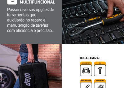 A solução completa para as atividades de reparo está a apenas um jogo de ferramentas de distância. Com um design funcional, o WAP KIT DE FERRAMENTAS 110 PEÇAS WF M110 garante praticidade e eficiência em diversas tarefas automotiva, de marcenaria, bricolagem ou consertos em geral.
