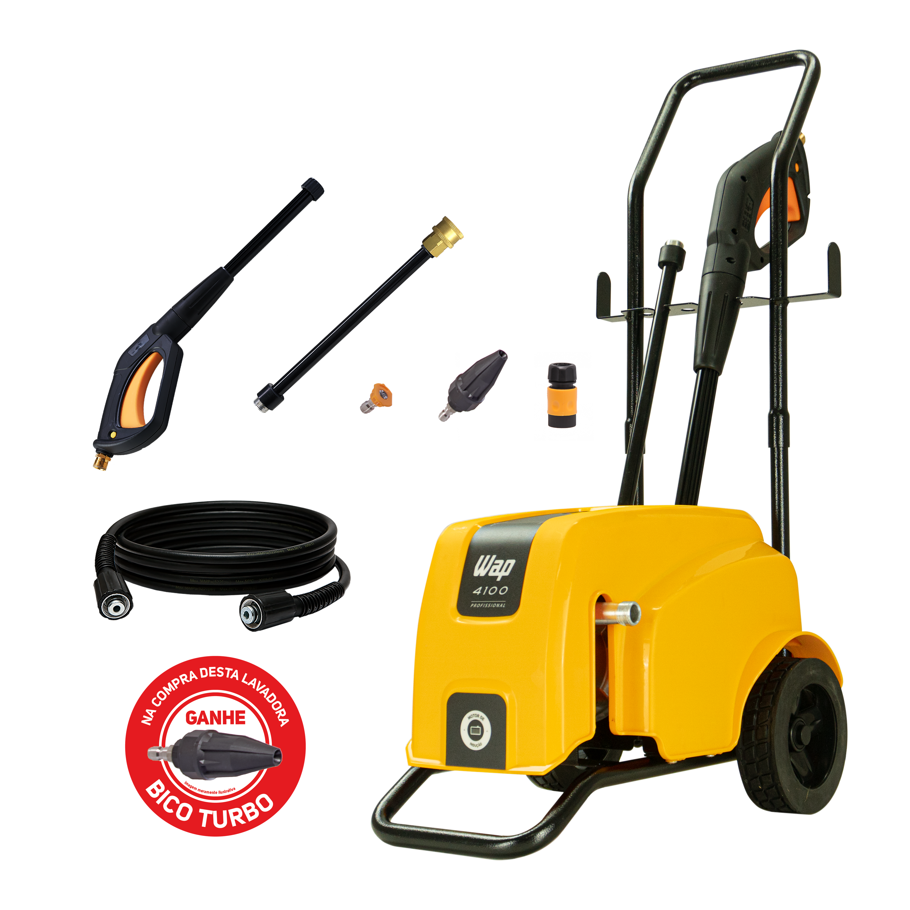 A lavadora de alta pressão WAP 4100 Turbo conta com uma bomba axial com cabeçote em alumínio e pistões em aço inox que garantem mais durabilidade ao produto. Além disso, vem com cabo elétrico de 5 metros e mangueira de alta pressão com em nylon de 7,5 metros que permitem cobrir uma grande área sem precisar locomover a máquina. Vem com trava de segurança da pistola, bico leque 15º e o sistema stop total, que corta o fluxo de água e a energia do motor ao soltar o gatilho, poupando energia e aumentando a vida útil do motor.