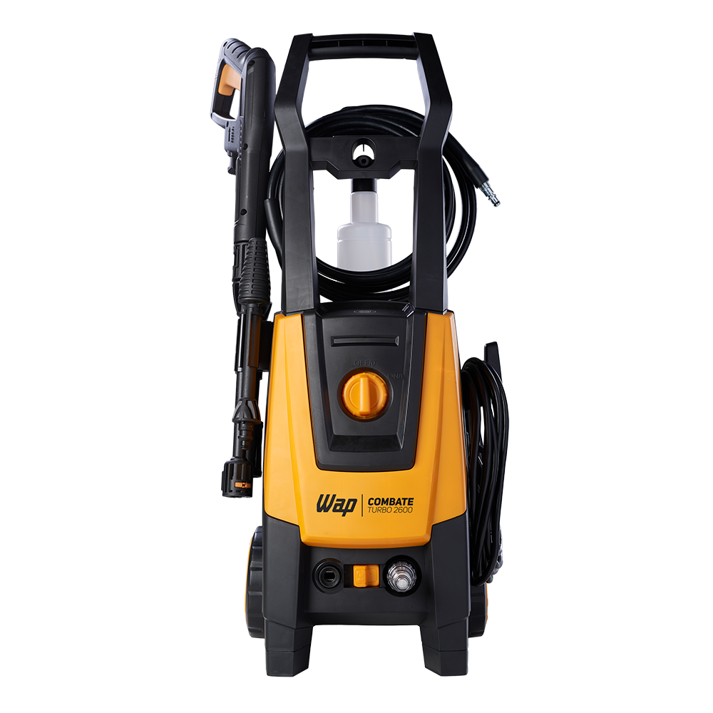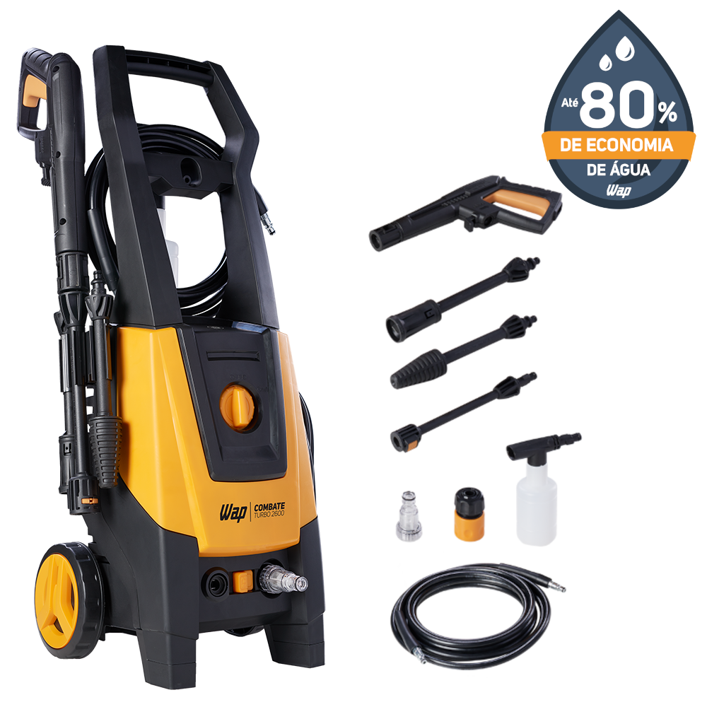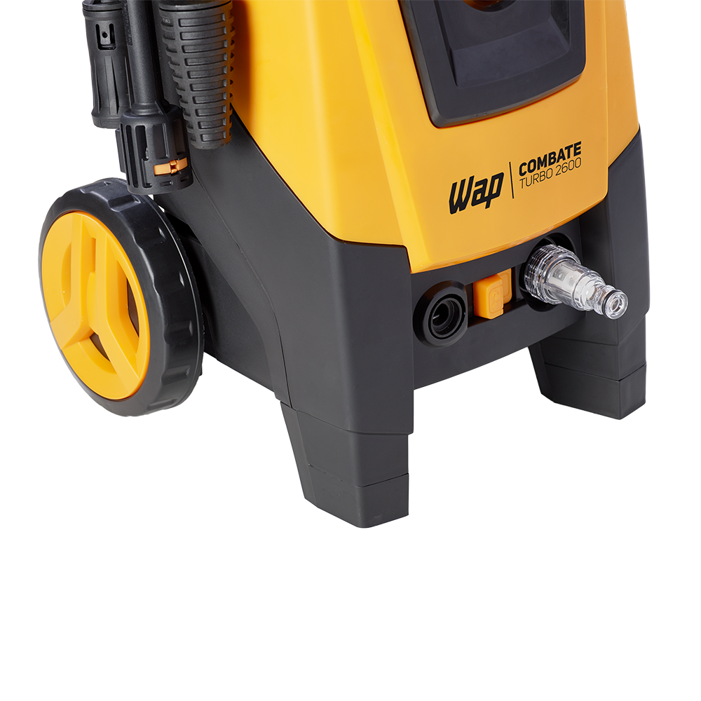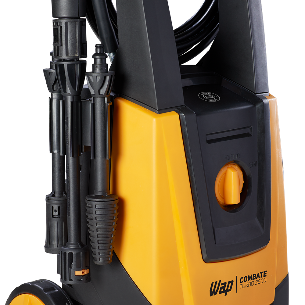 Equipada com alça e rodas que facilitam o transporte, a WAP Combate Turbo 2600 conta com cabo elétrico de 5 metros, mangueira de alta pressão de 5 metros, trava de segurança da pistola, bico regulável (leque ou concentrado), aplicador de detergente e o sistema stop total, que corta o fluxo de água e a energia do motor ao soltar o gatilho, poupando energia e aumentando a vida útil do motor.