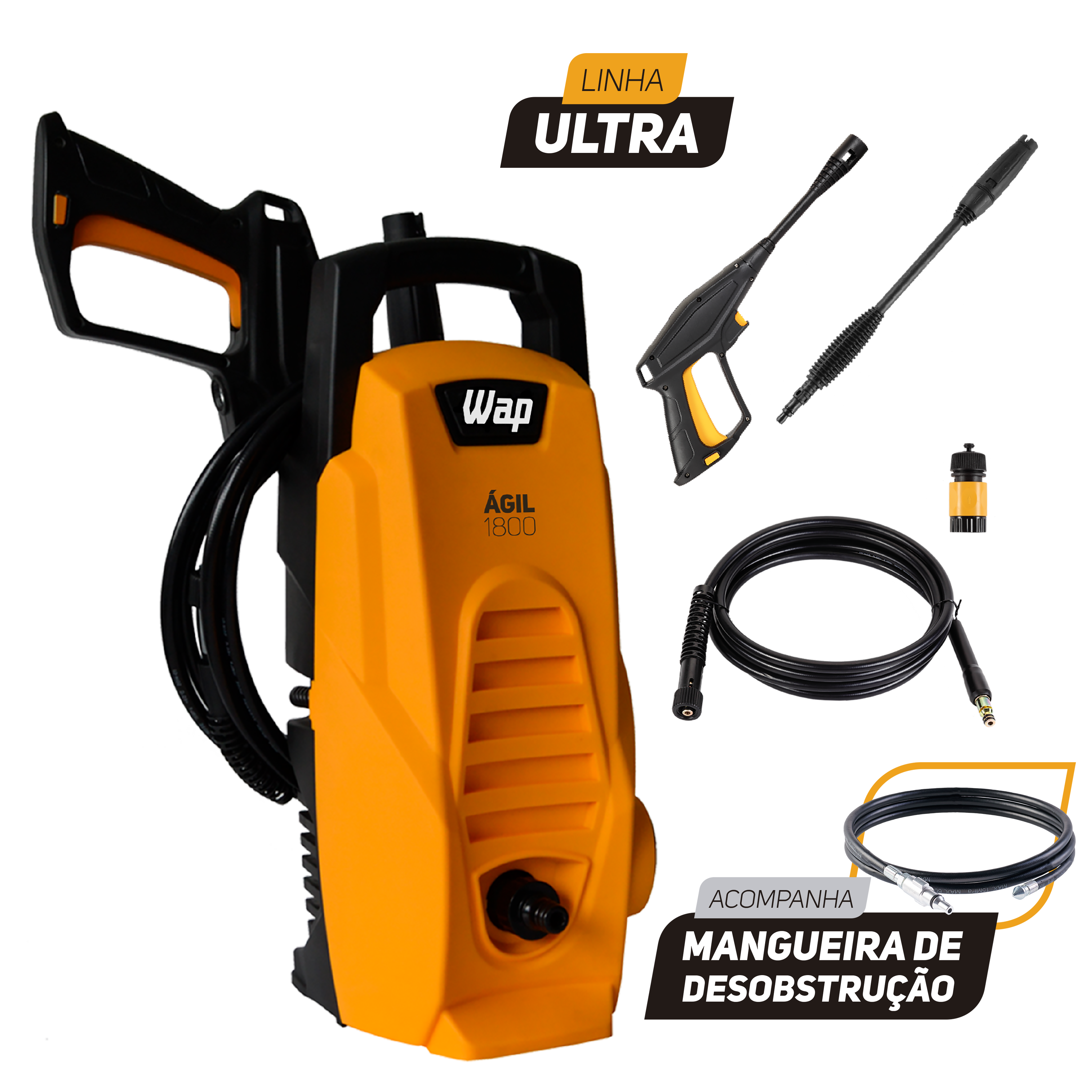 – 2 em 1, o Dobro de Vantagens! Desobstruidora e Lavadora de Alta Pressão WAP ÁGIL ULTRA 1800 com Mangueira de Desobstrução;