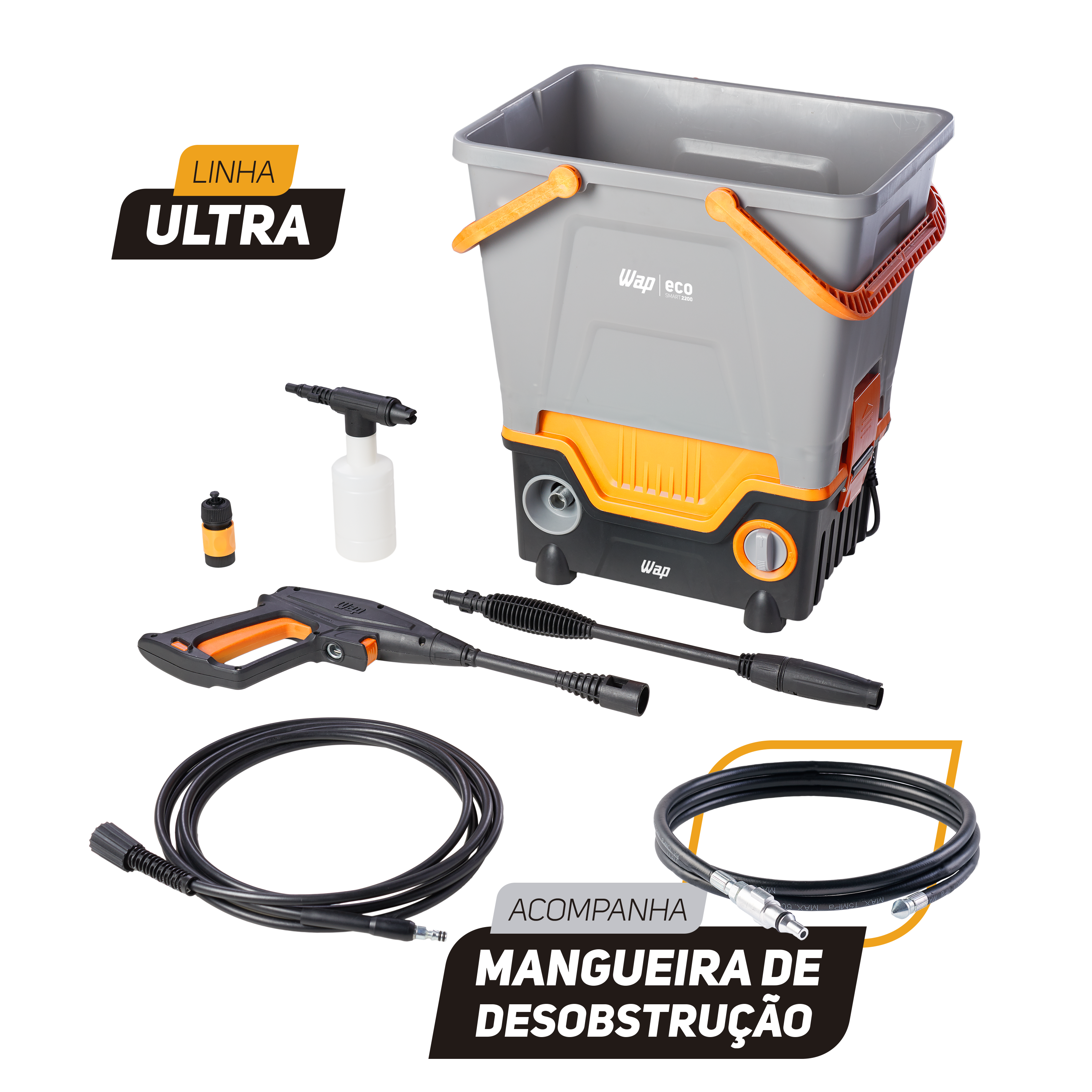 A Desobstruidora WAP Eco Smart ULTRA 2200 é econômica e sustentável. É a Máquina que Reutiliza Água, além de desentupir canos, calhas e tubulações com facilidade utilizando jato de água. Conheça a solução mais eficiente, econômica e sustentável para sua limpeza. A WAP Eco Smart ULTRA 2200 é a lavadora de alta pressão que REUTILIZA ÁGUA, enquanto você cuida da sua casa e do meio ambiente. Possui exclusivo reservatório de 23 litros que possibilita captar água da chuva, banho ou máquina de lavar para limpar todos os ambientes. Versátil, a WAP Eco Smart ULTRA 2200 também pode ser utilizada de forma tradicional conectada a uma mangueira de jardim.