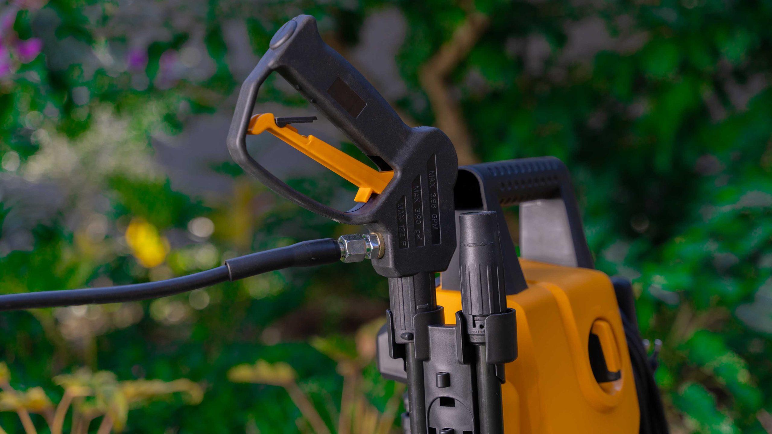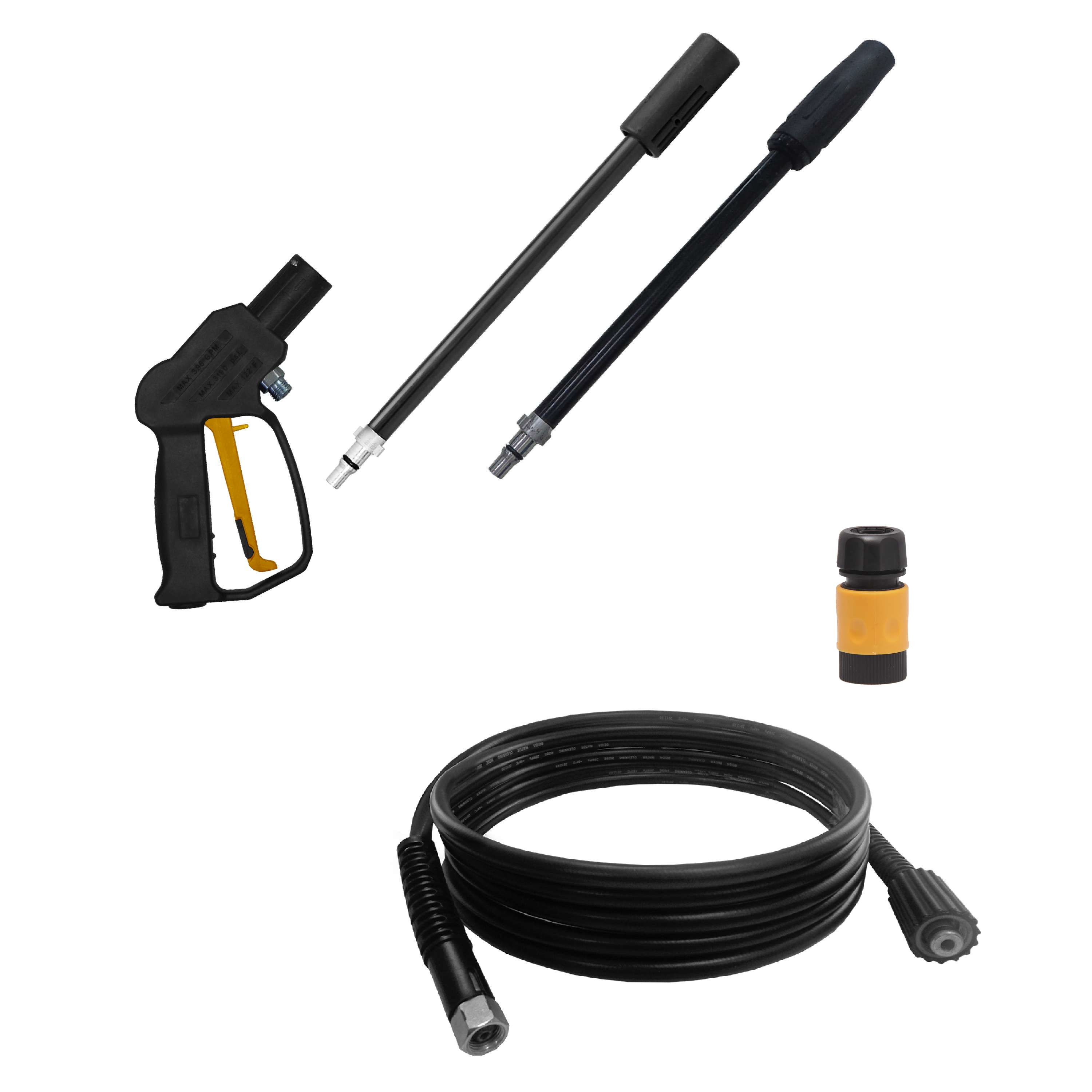 | 1 Pistola de alta pressão com trava de segurança. 1 Baioneta com conexão rápida. 1 Lança com bico de alta pressão regulável (concentrado e leque). 1 Mangueira de alta pressão de 3 metros. 1 Engate rápido. 1 Agulha de limpeza do bico de alta pressão. |