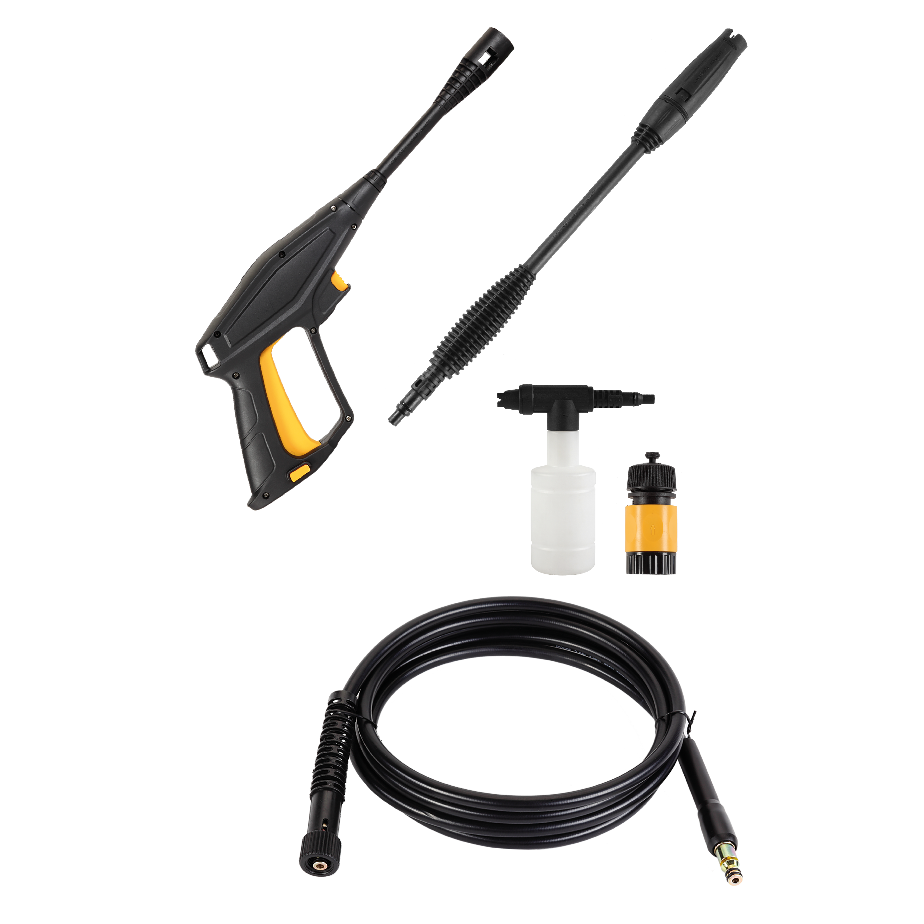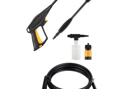 | 1 Pistola de alta pressão com trava de segurança. 1 Lança com bico regulável (leque e concentrado). 1 Mangueira de alta pressão de 5 metros. 1 Engate rápido. 1 Aplicador de detergente com conexão rápida. 1 Agulha de limpeza do bico. |