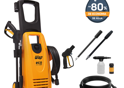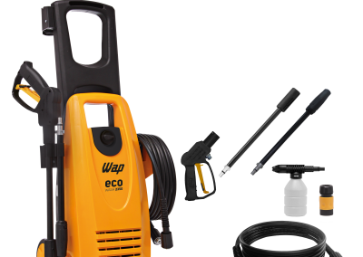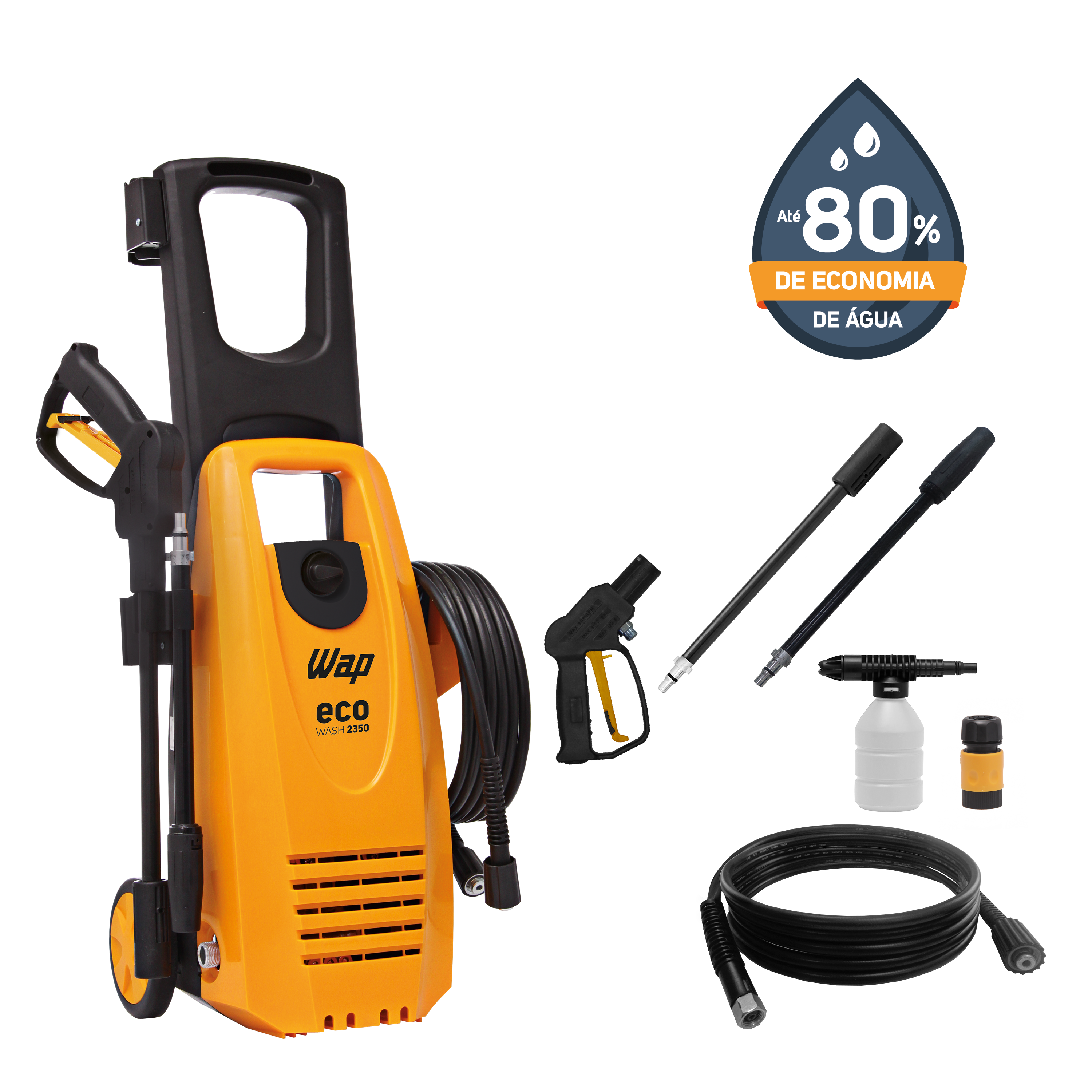 A lavadora de alta pressão WAP Eco Wash 2350, o equipamento perfeito para a remoção de sujeira em pisos e superfícies. É ideal para lavar calçadas, bicicletas, motos, carros e paredes com pressão, rapidez e agilidade, além de economizar até 80% de água se comparada à mangueira comum. Equipada com alça e rodas que facilitam o transporte, a WAP Eco Wash 2350 conta com cabo elétrico de 5 metros, mangueira de alta pressão de 5 metros, trava de segurança da pistola, bico regulável (concentrado ou leque), aplicador de detergente e o sistema stop total, que corta o fluxo de água e a energia do motor ao soltar o gatilho, poupando energia e aumentando a vida útil do motor.