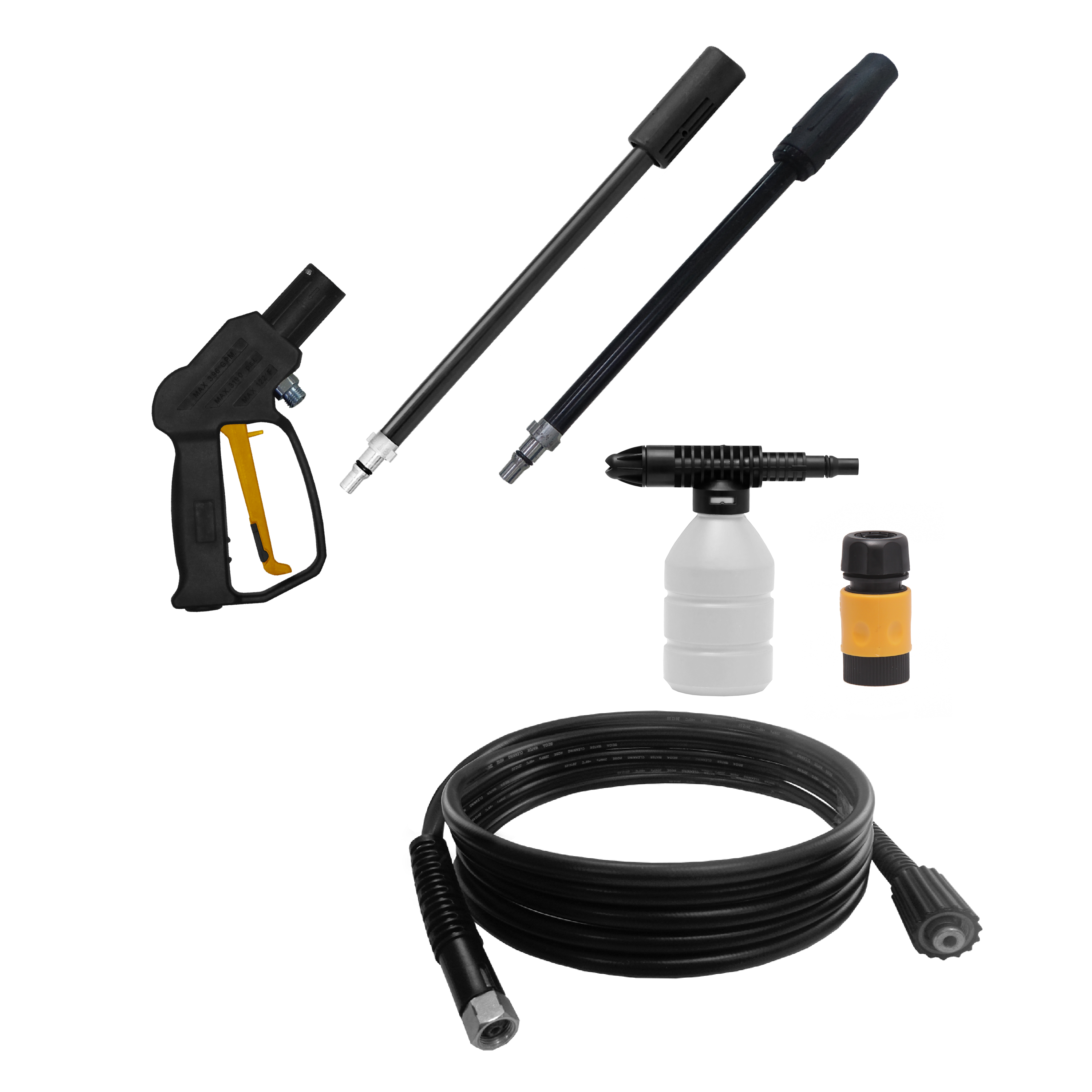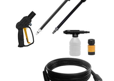 | 1 Pistola de alta pressão com trava de segurança. 1 Baioneta com conexão rápida. 1 Lança com bico regulável (leque e concentrado). 1 Mangueira de alta pressão de 5 metros. 1 Engate rápido. 1 Aplicador de detergente com conexão rápida. 1 Agulha de limpeza do bico. |
