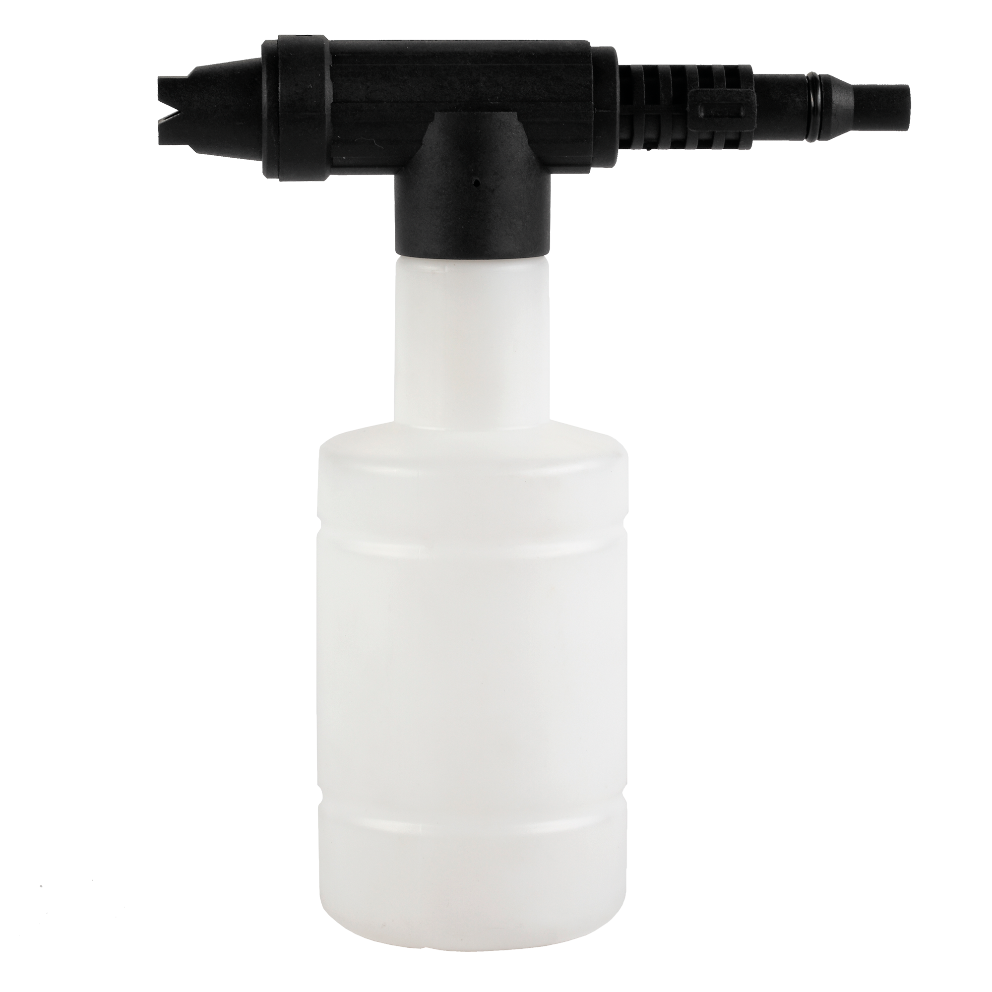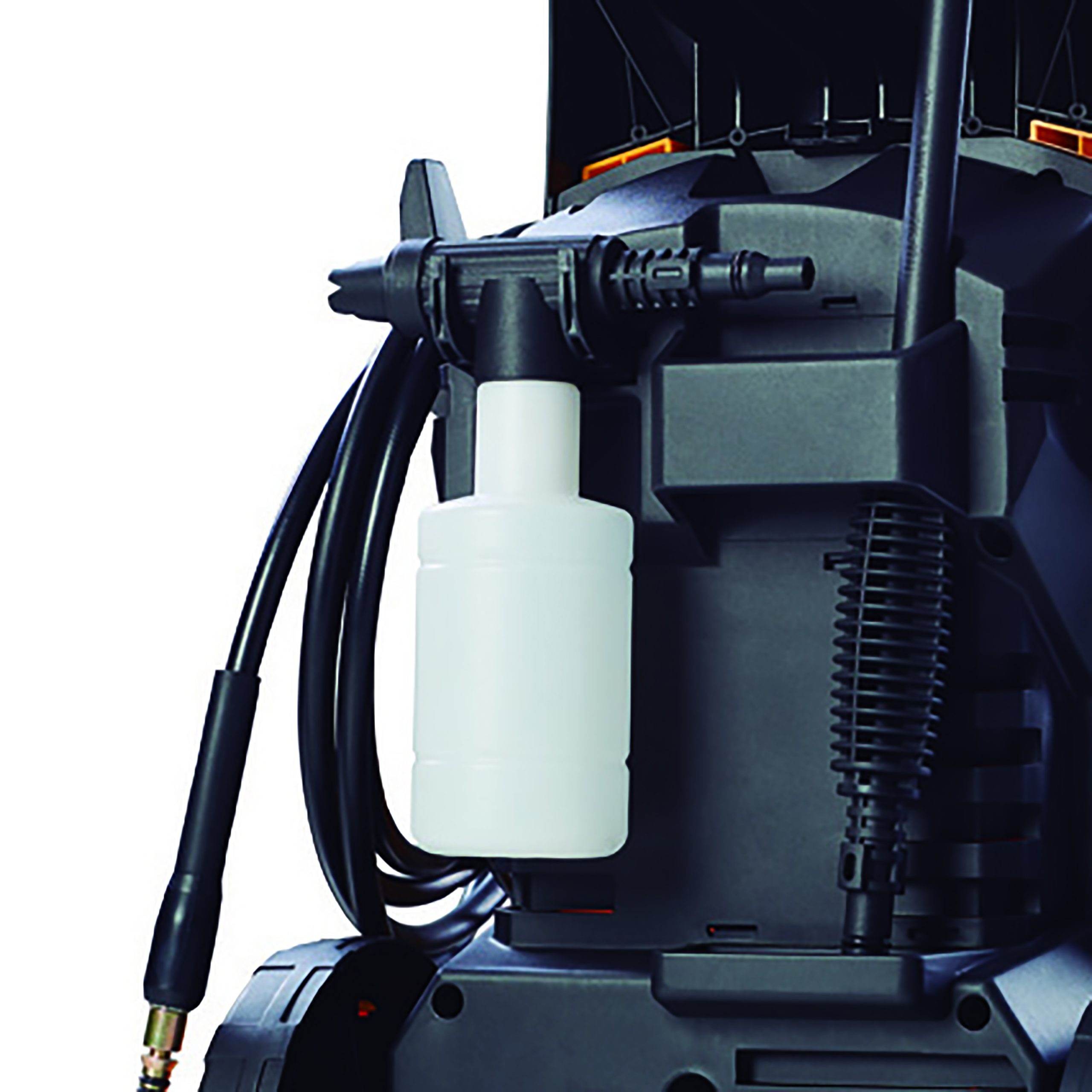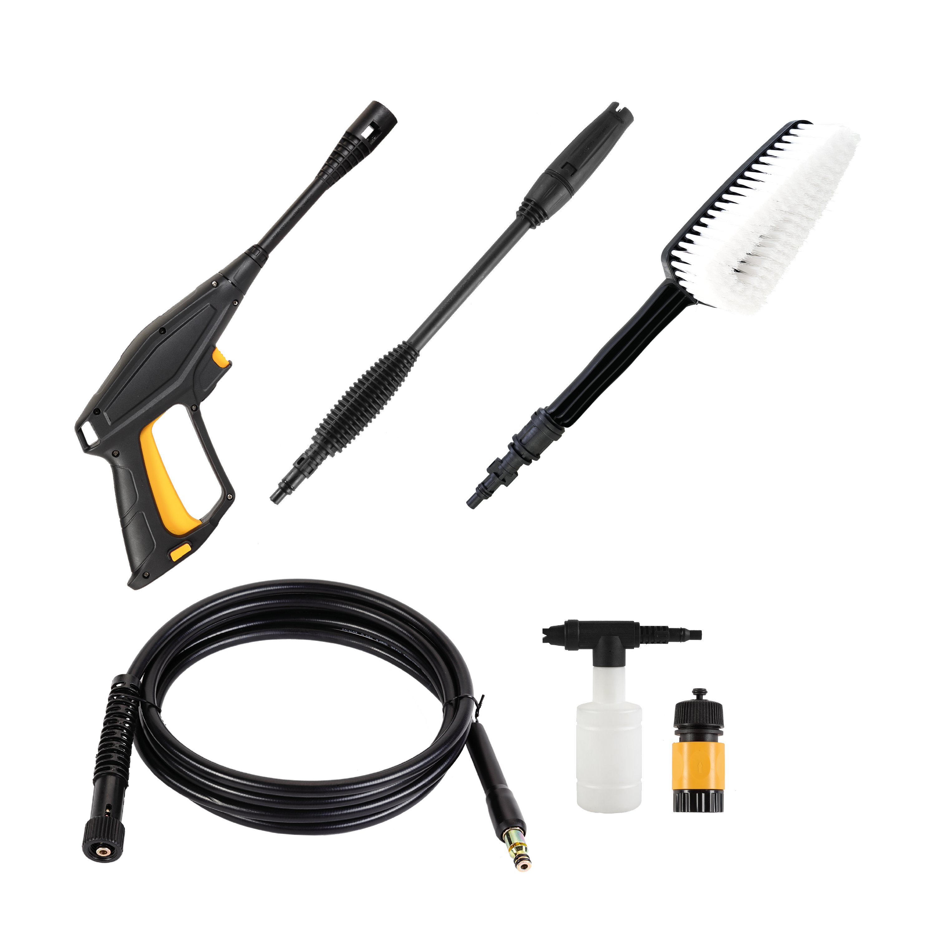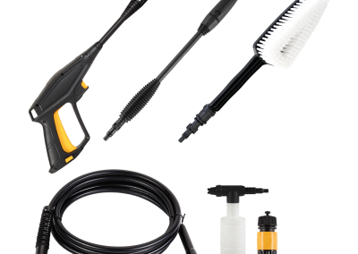 | 1 Pistola de alta pressão. 1 Engate rápido. 1 Lança com bico de alta pressão regulável (concentrado e leque). 1 Mangueira de alta pressão de 3 metros. 1 Escova triangular. 1 Aplicador de detergente. |
