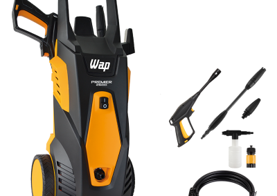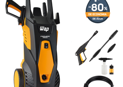 Equipada com alça e rodas que facilitam o transporte, a WAP Premier 2600 conta com cabo elétrico de 5 metros, mangueira de alta pressão de 5 metros, trava de segurança da pistola, bico regulável (concentrado ou leque), aplicador de detergente e o sistema stop total, que corta o fluxo de água e a energia do motor ao soltar o gatilho, poupando energia e aumentando a vida útil do motor.