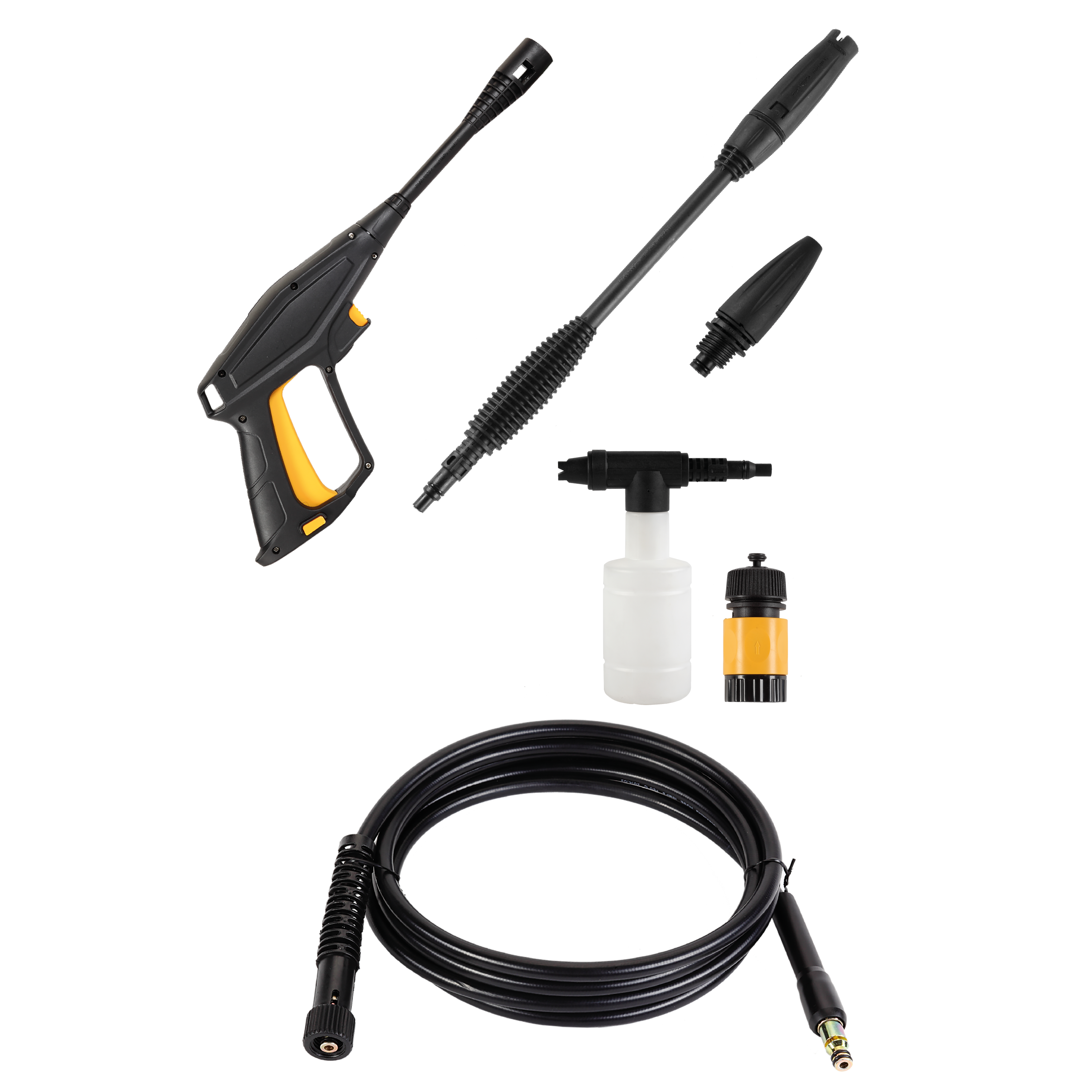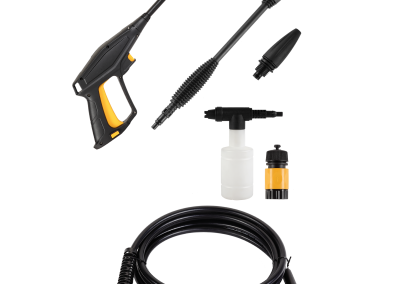 | 1 Pistola de alta pressão com trava de segurança. 1 Bico regulável (leque e concentrado). 1 Bico turbo. 1 Mangueira de alta pressão de 5 metros. 1 Aplicador de detergente. 1 Engate rápido. 1 Agulha de limpeza do bico. |