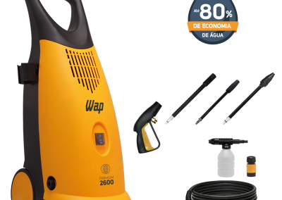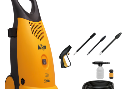 A lavadora de alta pressão WAP Premium 2600 é a melhor opção para limpar sujeiras pesadas e profundas de grandes áreas com rapidez e agilidade, com economia de tempo e de até 80% de água se comparada à mangueira comum. Com motor de indução, bico turbo, potência de 1900W e pressão máxima de 2400 PSI é o equipamento de uso frequente perfeito para a remoção de níveis incrustados de sujeira nos mais diversos tipos de pisos e superfícies.