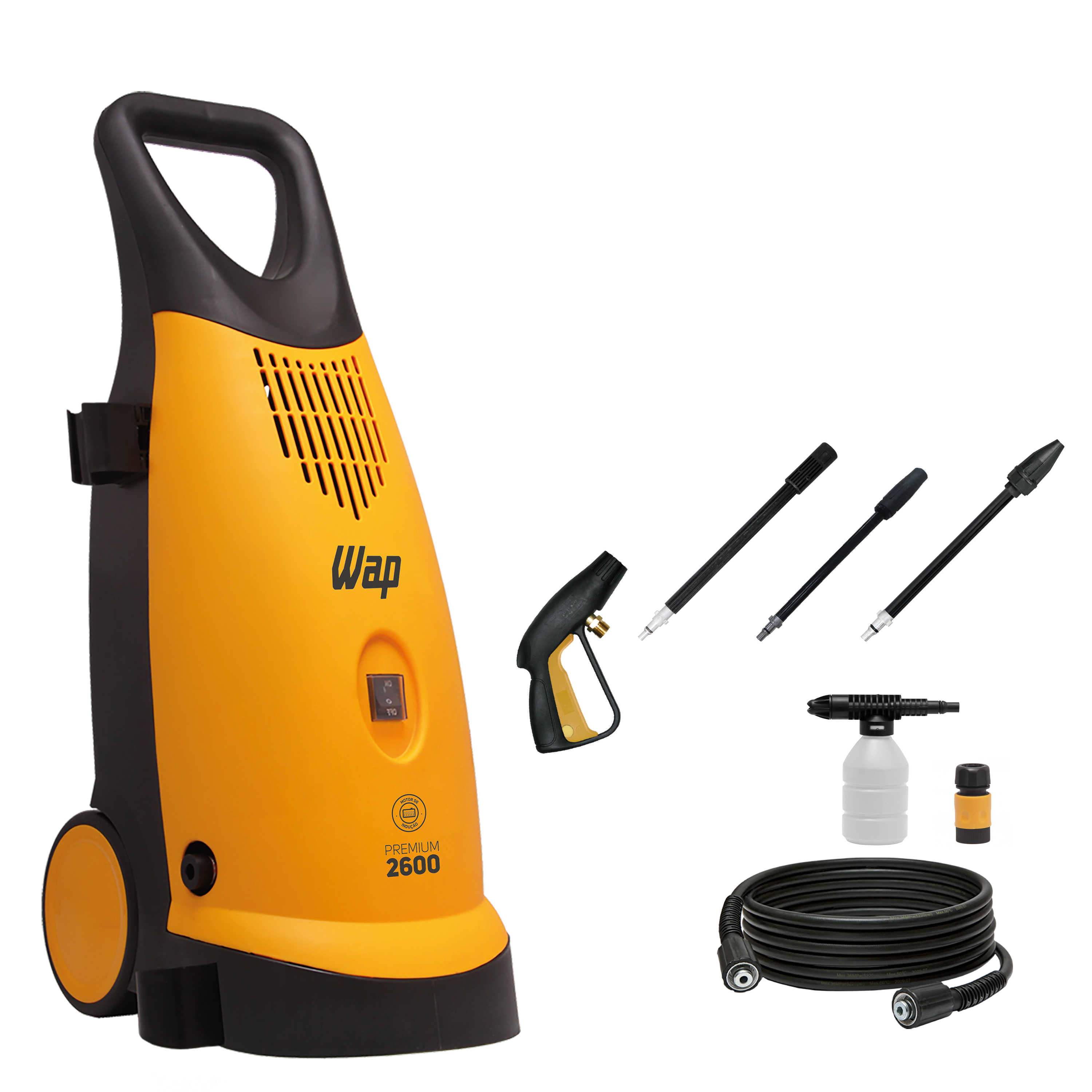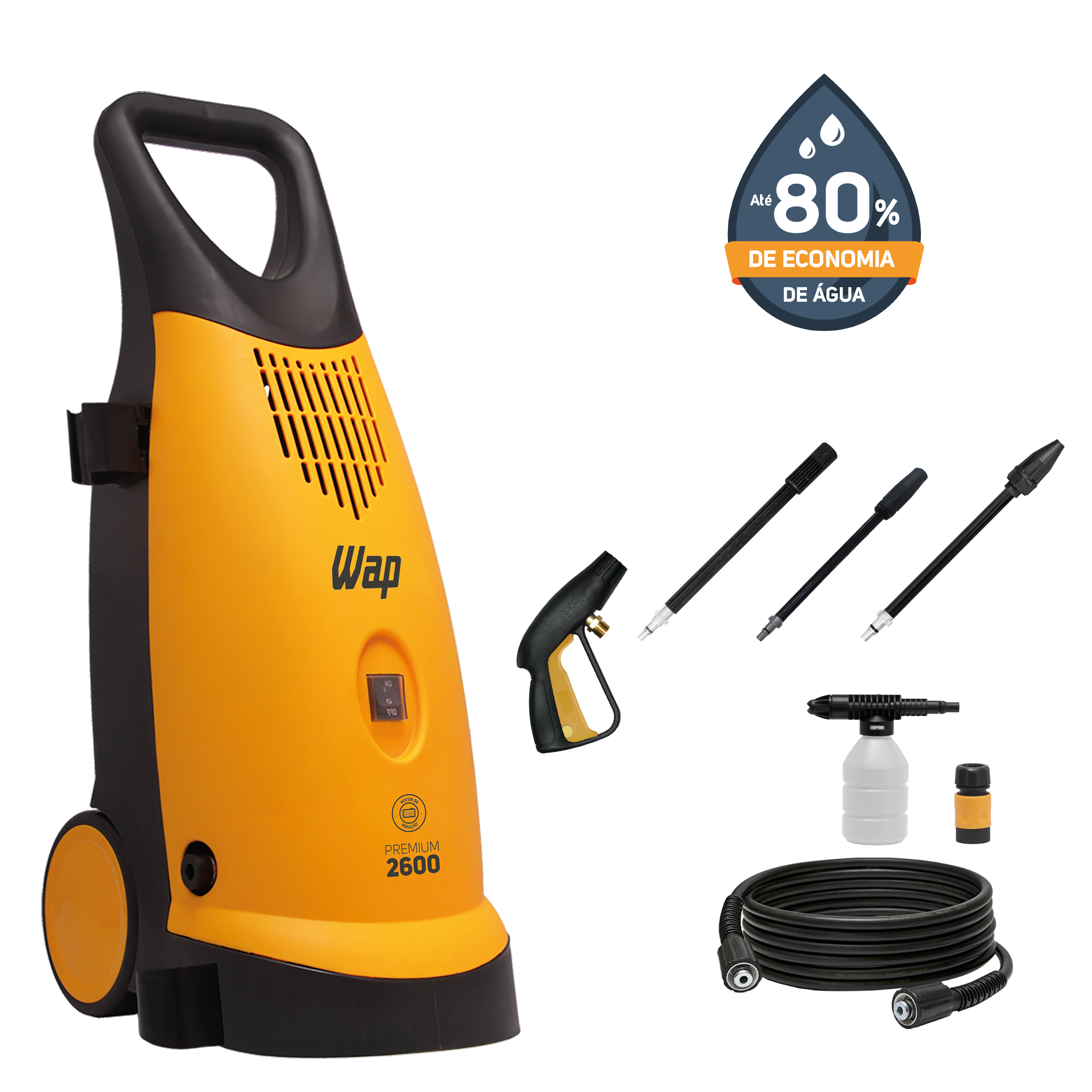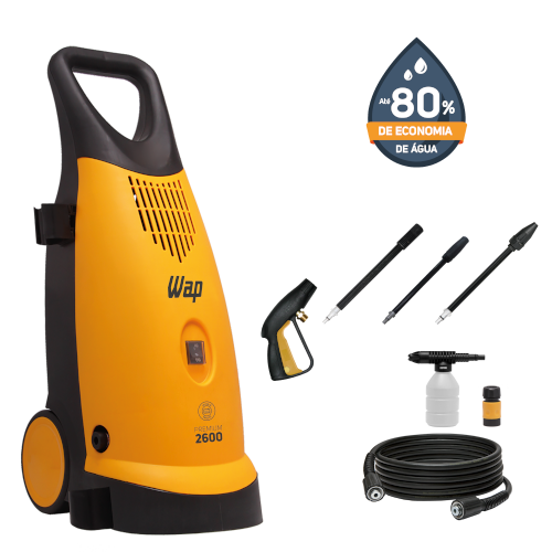 Equipada com alça e rodas que facilitam o transporte, a WAP Premium 2600 conta com cabo elétrico de 5 metros e mangueira de alta pressão com trama de aço de 5 metros que permitem cobrir uma grande área sem precisar locomover a máquina. Além disso, vem com trava de segurança da pistola, bico regulável (concentrado ou leque), aplicador de detergente e o sistema stop total, que corta o fluxo de água e a energia do motor ao soltar o gatilho, poupando energia e aumentando a vida útil do motor. A lavadora de alta pressão conta também com pistões em aço inox que, junto com o motor de indução, conferem mais durabilidade para o produto.