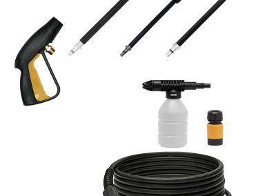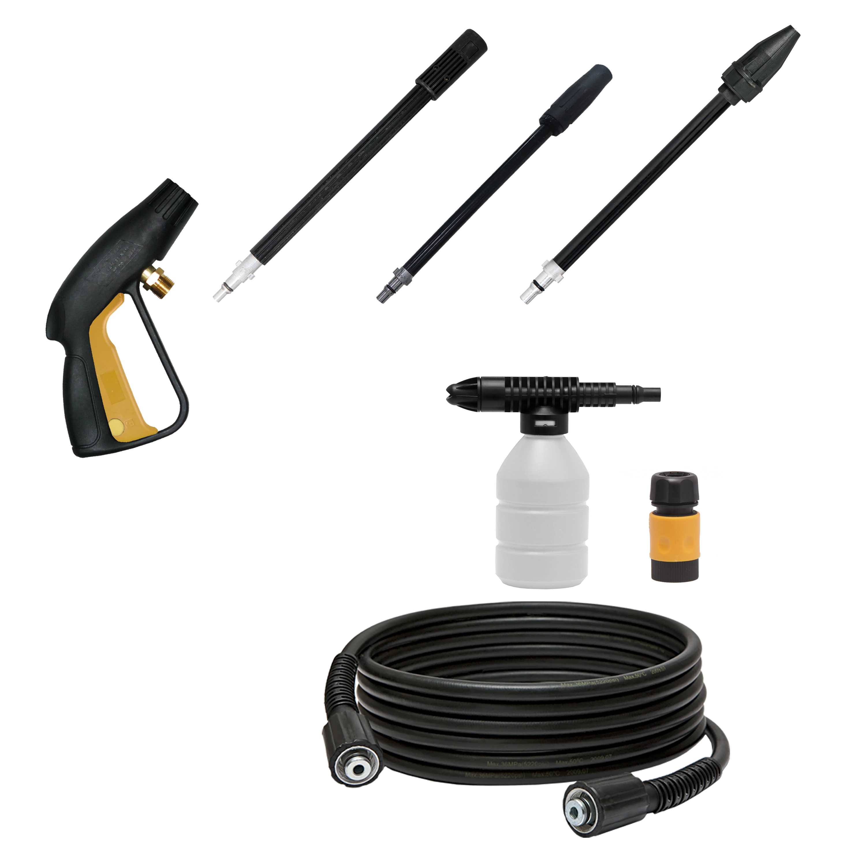 | 1 Pistola de alta pressão com trava de segurança. 1 Baioneta com conexão rápida. 1 Lança com bico regulável (leque e concentrado). 1 Lança com bico turbo. 1 Aplicador de detergente. 1 Mangueira de alta pressão de 5 metros com trama de aço. 1 Engate rápido. 1 Agulha de limpeza do bico. |