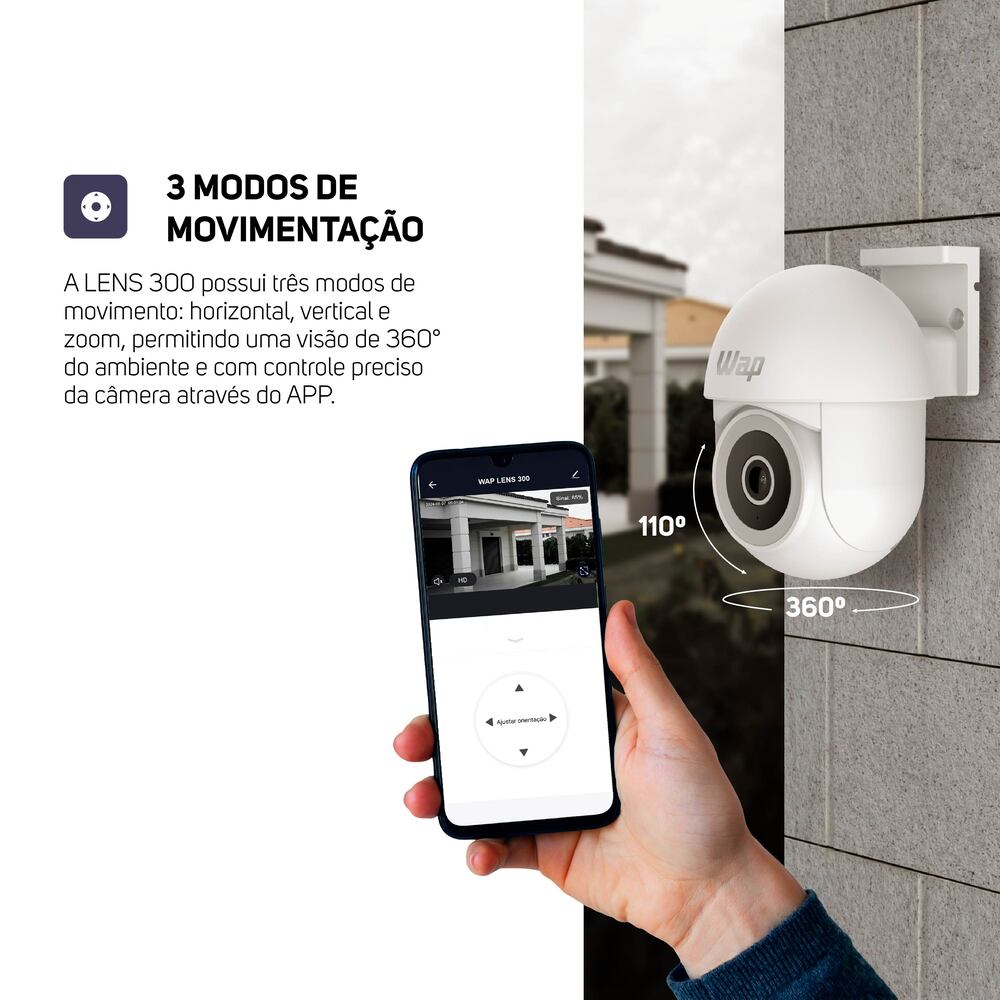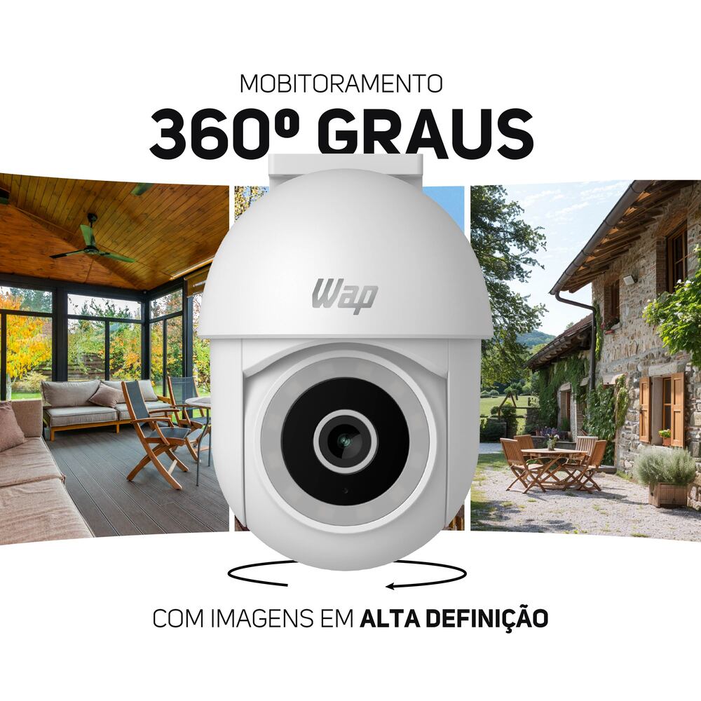 A Smart Câmera 360° Outdoor WAP LENS 300 é sinônimo de potência, durabilidade, design e principalmente de praticidade. Com uma visão abrangente de 360° graus, ela é ideal para ambientes internos e externos, assegurando que você não perca nenhum detalhe.