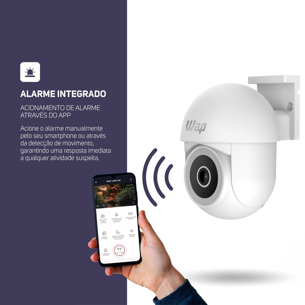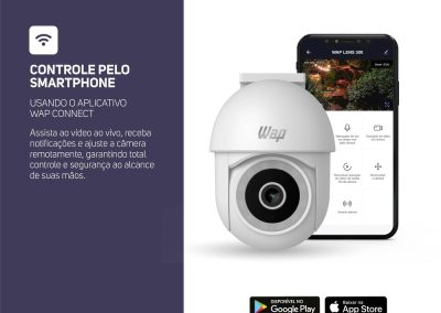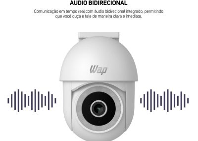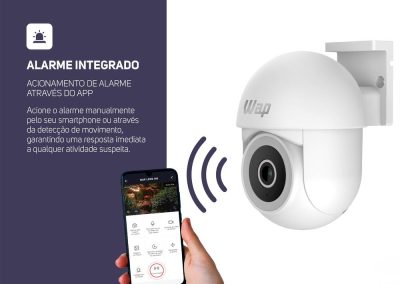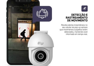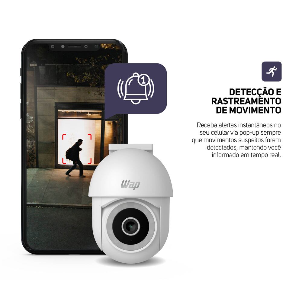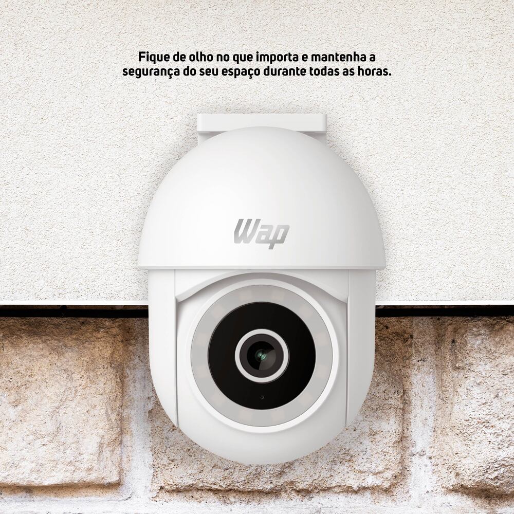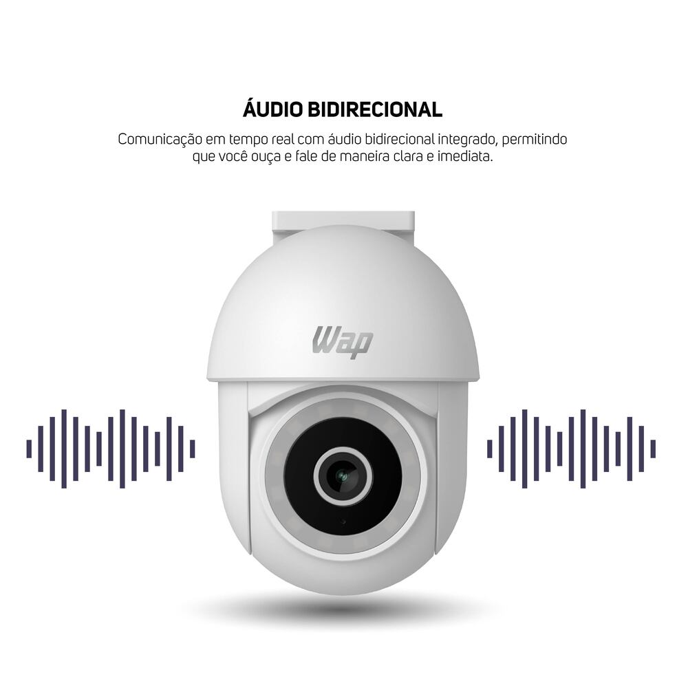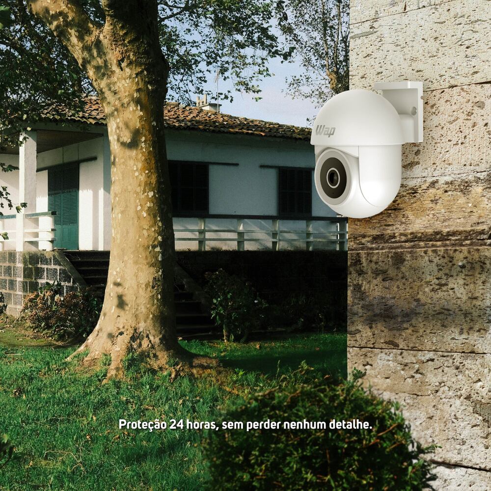 Para melhorar ainda mais o monitoramento, a câmera outdoor possui detecção e rastreamento de movimento e o áudio bidirecional, que possibilitam uma resposta rápida a qualquer atividade suspeita. Compatível com dispositivos Android e IOS, o aplicativo WAP CONNECT permite acionar o alarme integrado e receber notificações em tempo real via pop-up.