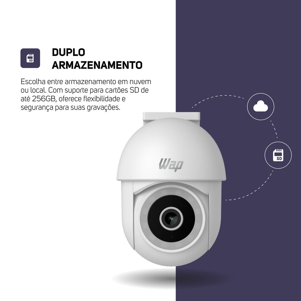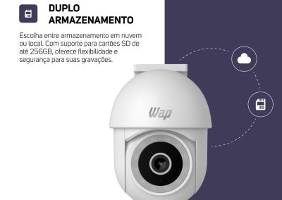 Armazene suas gravações na nuvem ou localmente, com um MicroSD de até 256GB. Garanta segurança total para você e sua família com a Smart Câmera 360° Outdoor WAP LENS 300, a combinação de tecnologia e simplicidade.