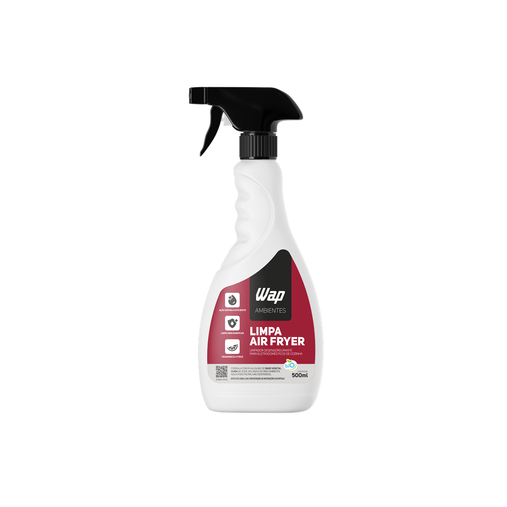O Limpa Air Fryer Wap é um limpador que remove a gordura difícil que fica depositada na parte interna e externa das Air Fryers Wap, podendo também ser utilizado em outros eletrodomésticos (grills, fogões, micro-ondas, geladeiras, fornos, exaustores, coifas, liquidificadores, sanduicheiras), utensílios de cozinha como grelhas, churrasqueiras, entre outros. Ele pode ser aplicado em metais, plásticos, esmaltados e outras superfícies laváveis.