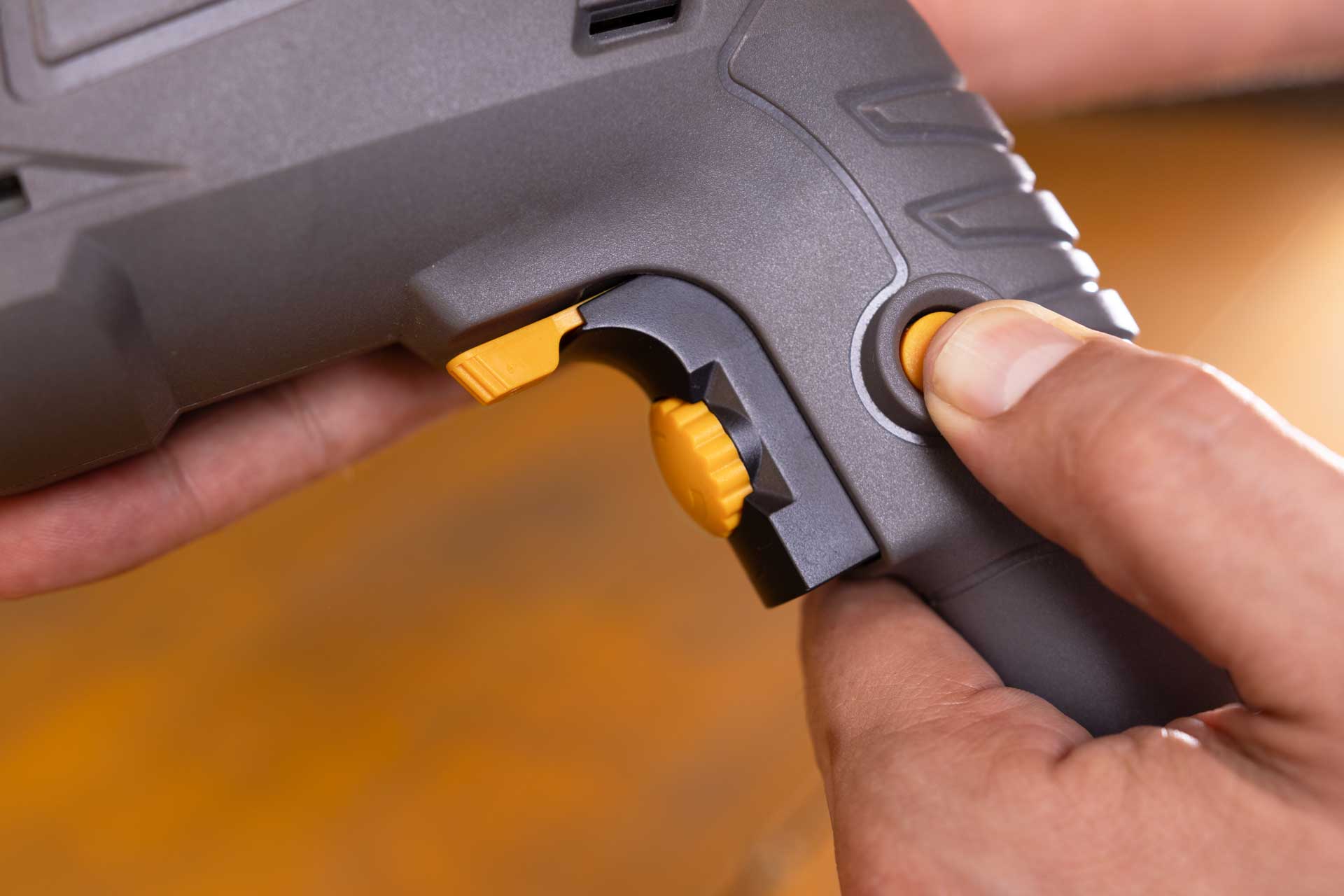 - Mantenha o gatilho da ferramenta acionado continuamente, sem a necessidade de pressioná-lo constantemente, utilizando o botão trava da ferramenta.