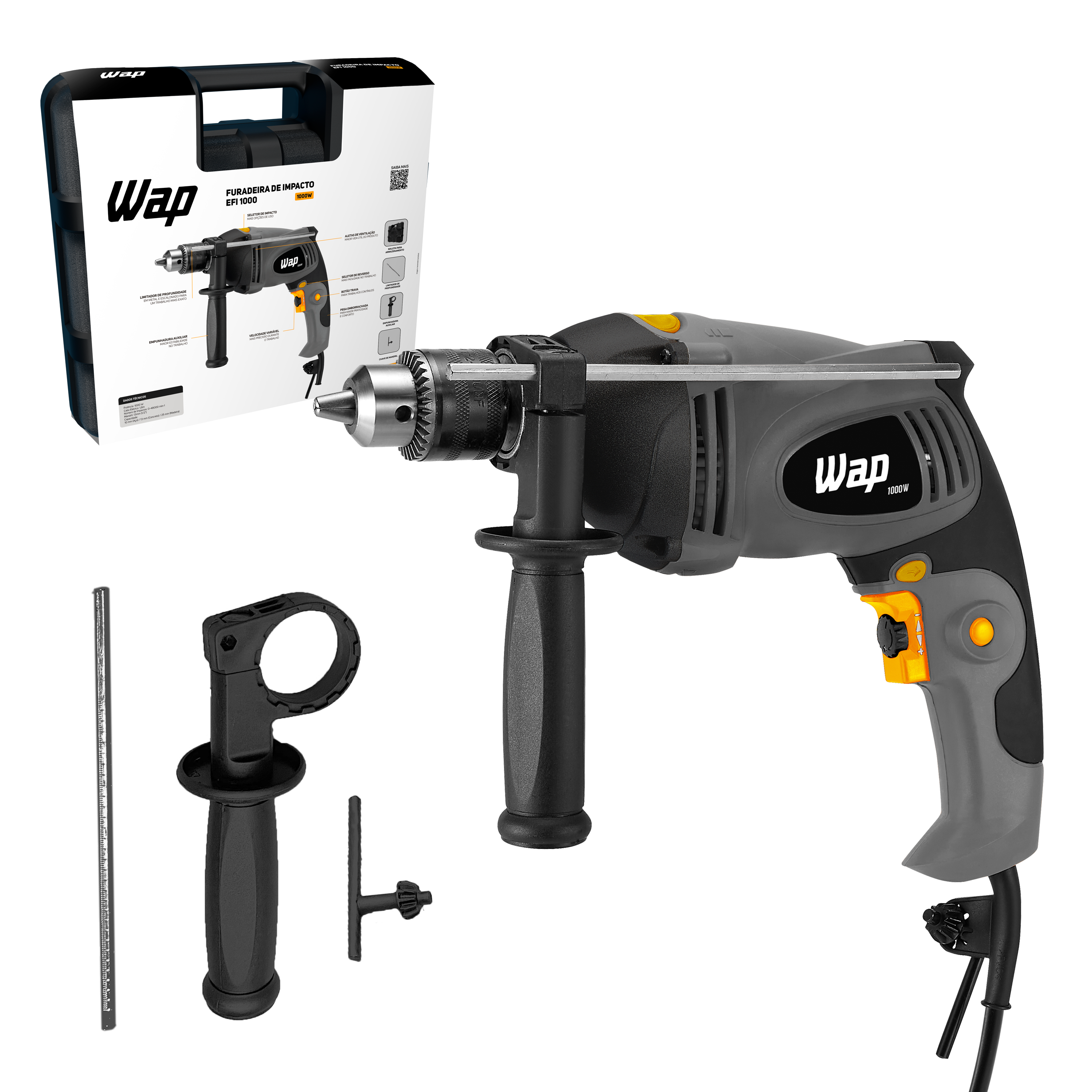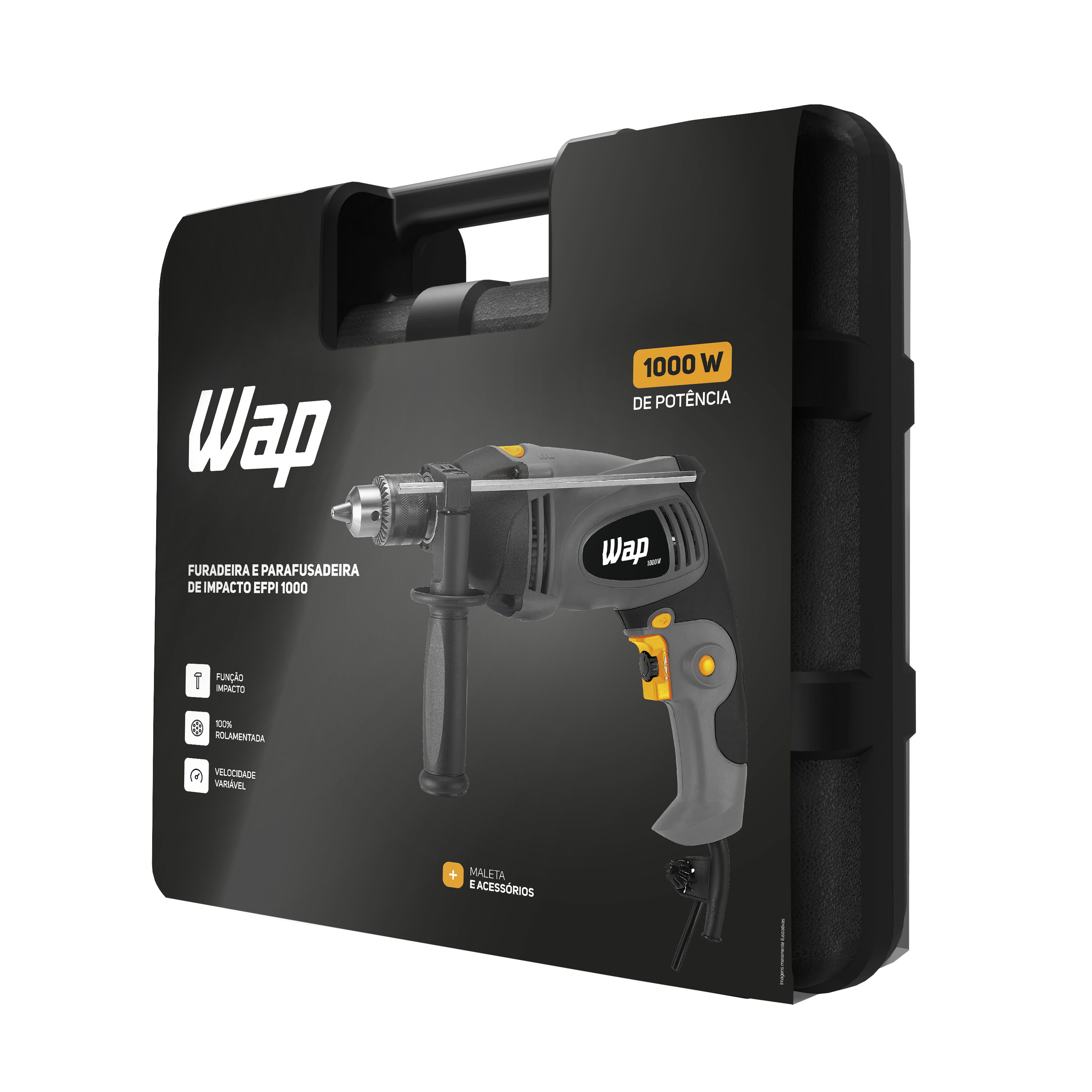 Com 1000W de potência e mandril de ½” a Furadeira e Parafusadeira de Impacto WAP EFPI 1000 possuí uma capacidade para trabalhos mais pesados e com a qualidade de um produto profissional. Ela oferece uma excelente capacidade de perfuração em concreto, aço e madeira. A ferramenta possuí um sistema de rolamento e velocidade variável e reversível com trava para uso contínuo, ela é eficiente e leva a qualidade da marca WAP.