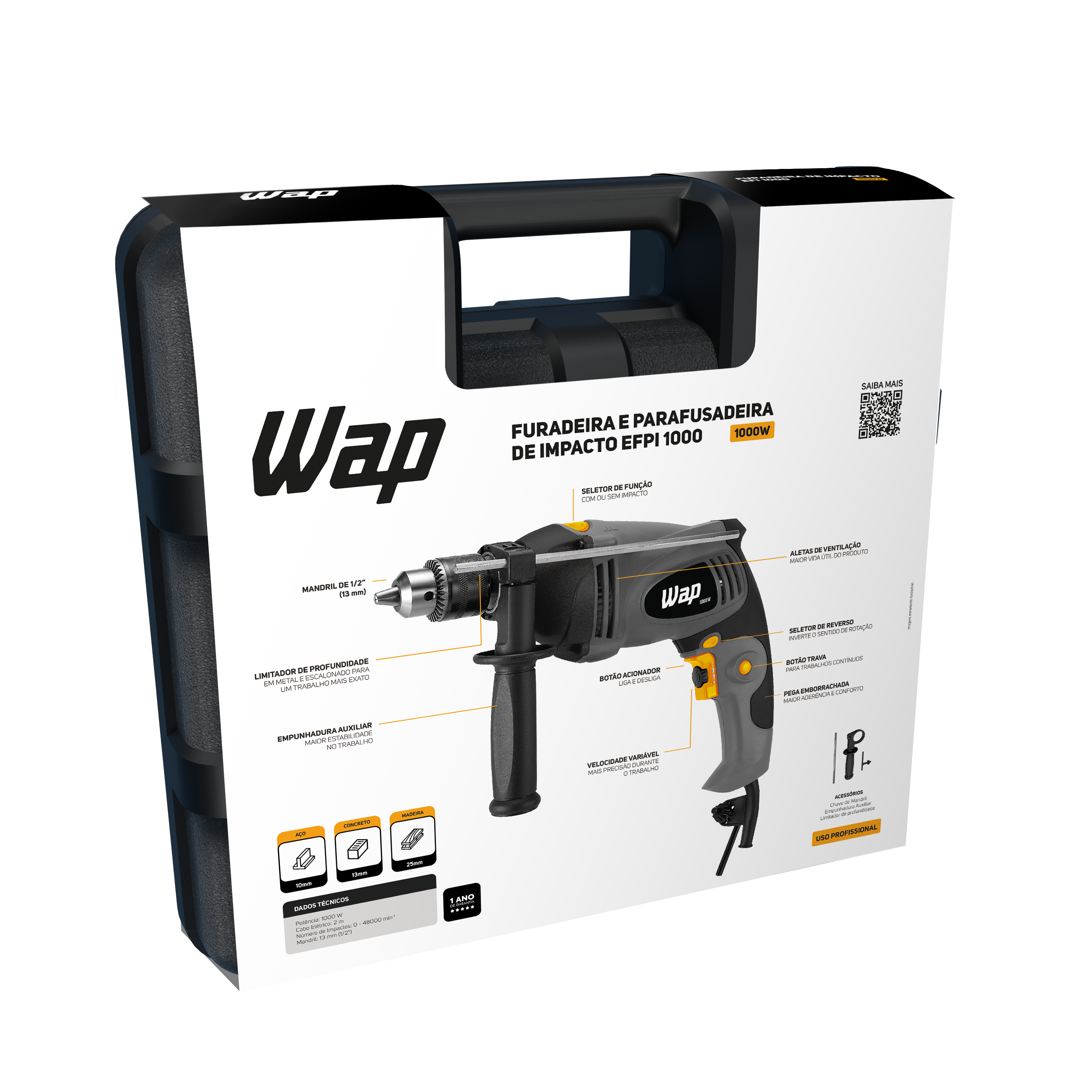 Seu design ergonômico que garante uma operação segura e confortável. Sua empunhadura emborrachada e seu punho auxiliar multidirecional, garante uma adaptação adequada às características pessoais de cada usuário. Esta Furadeira e Parafusadeira de Impacto WAP EFPI 1000 tem um cabo elétrico de 1,8 metros, regulagem de velocidade e possui aberturas de ventilação de ar que ajudam na refrigeração do motor e caixa de engrenagem em alumínio que ajuda na dissipação do calor para trabalhos mais intensos, prolongando a vida útil do equipamento.