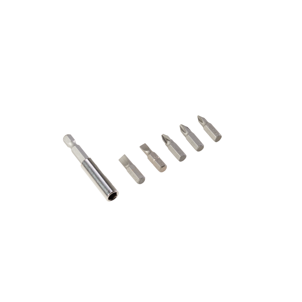 | 1x Broca Madeira/Aço 1,5 mm; 1x Broca Madeira/Aço 2,5 mm; 1x Broca Madeira/Aço 3,0 mm; 1x Broca Madeira/Aço 4 mm; 1x Broca Madeira/Aço 5 mm; 1x Suporte Magnético de Bit 1/4"; 1x Pozidrive (PZ2); 1x Phillips (PH2); 1x Phillips (PH1); 1x Fendas (5 mm); 1x Fendas (6 mm); Maleta; |