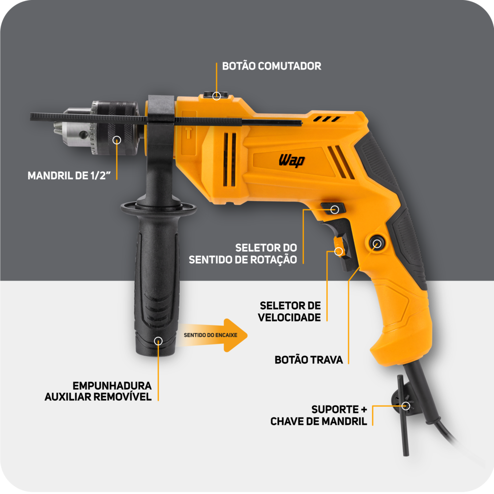 Parafusadeira e Furadeira de Impacto ½" WAP WF 700 FE13 700W Com Empunhadura Auxiliar 127V