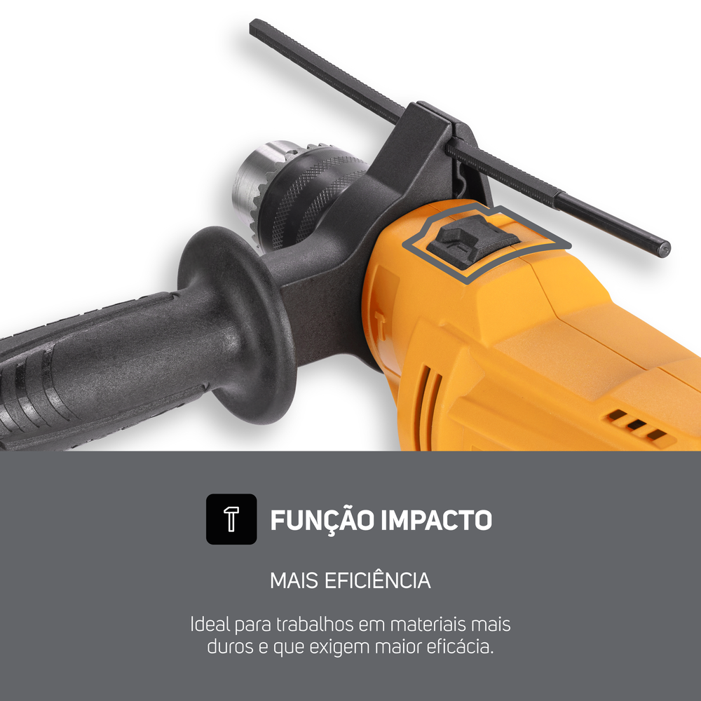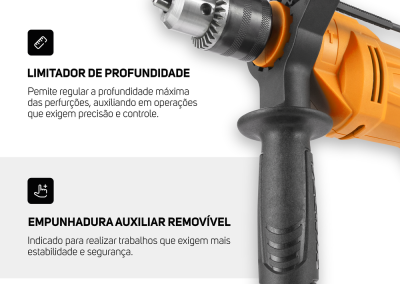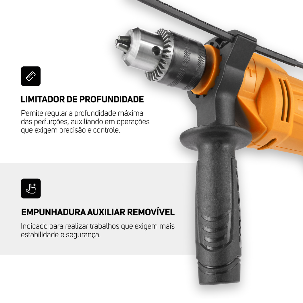 Escolha entre perfurar com ou sem impacto com o botão comutador, adicionando impactos simultâneos a rotação, para realizar trabalhos em materiais mais duros e que exigem maior eficácia. Mantenha-se no controle, sem perfurar além do necessário, com o limitador de profundidade que acompanha a ferramenta. Ele evita acidentes ao marcar exatamente a medida necessária para o furo.