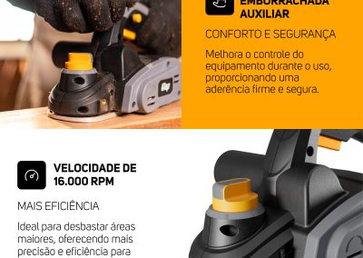 Além de proporcionar conforto durante o manuseio, a empunhadura auxiliar emborrachada melhora o controle do equipamento, tornando a aderência firme e segura. A velocidade de 16.000 RPM garante uma operação rápida, elevando sua produtividade a cada projeto.