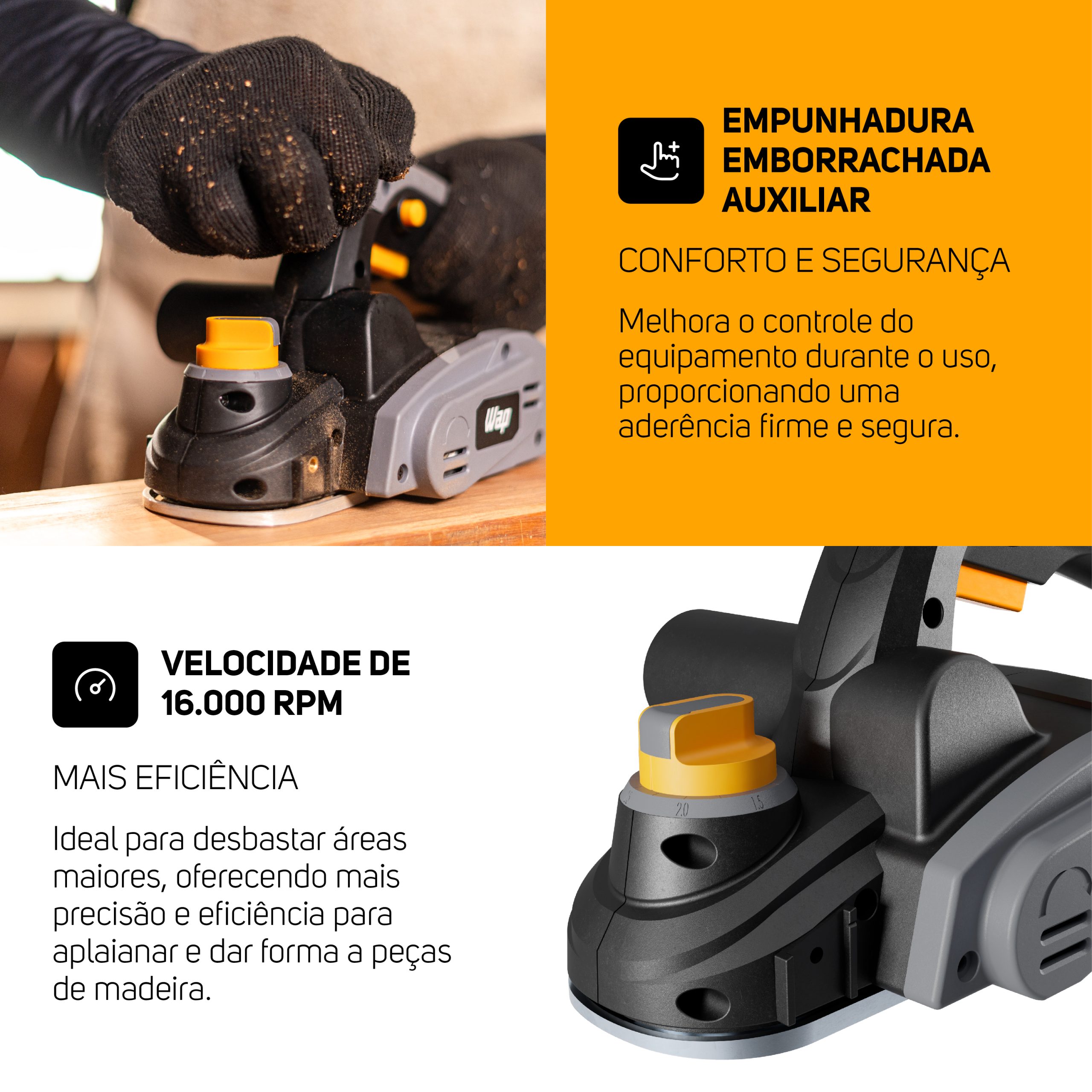 Faça aplainamentos sem esforço com uma ferramenta potente, pronta para enfrentar qualquer desafio ao seu lado como a PLAINA ELÉTRICA WAP WF PE01.