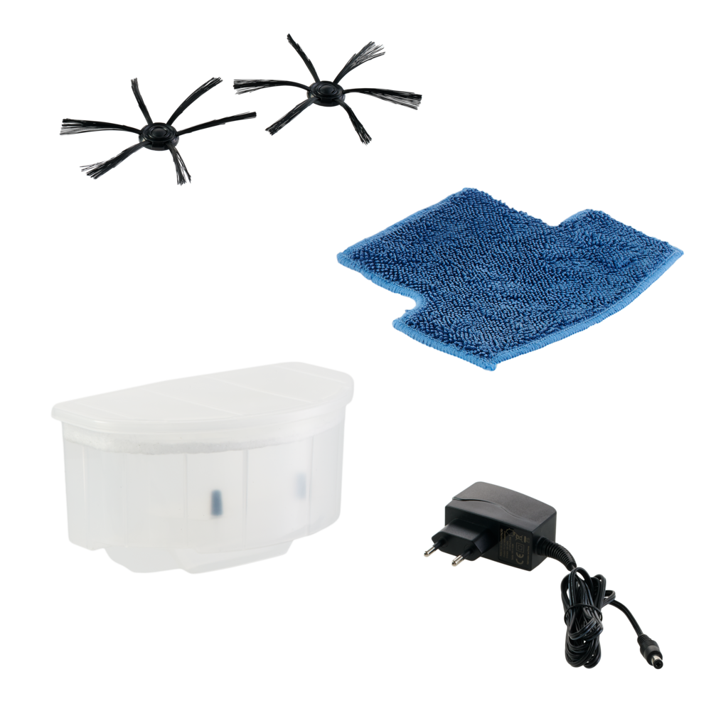 | 1 MOP em microfibra; 1 Carregador Bivolt; 1 Escova giratória direita; 1 Escova giratória esquerda; 1 Filtro de tecido lavável. |