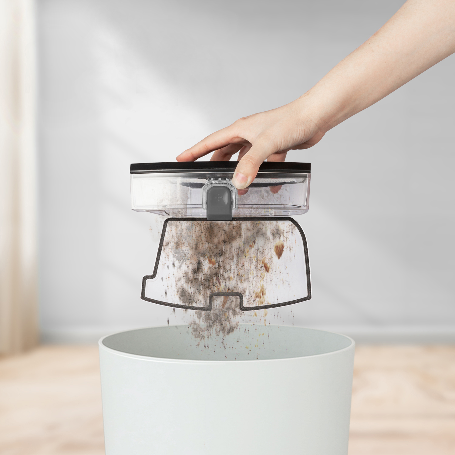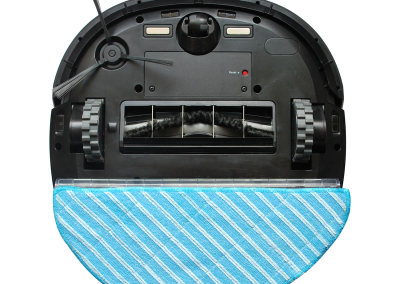 O WAP ROBOT WSMART possui um recipiente para água ou produto de limpeza com capacidade de até 150ml que, por gravidade, umedece o MOP que é passado no chão automaticamente.