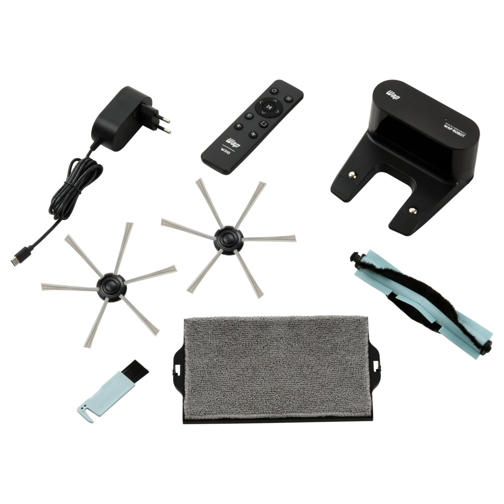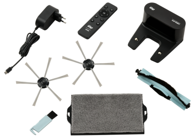 | 1 Carregador Bivolt; 2 Escovas giratórias; 1 Escova com lâmina de limpeza; 1 Controle remoto; 1 Base de carregamento; 1 MOP em microfibra; 2 Pilhas AAA; |