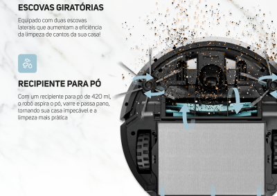 - Equipado com duas escovas giratórias, elas aumentam a eficiência da limpeza de cantos e aspiração de sujeiras.