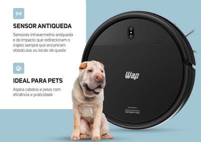 Ideal para diferentes superfícies e quem possui pets, o produto aspira cabelos e pelos com eficiência e praticidade. Otimize a rotina de limpeza de casa com a tecnologia e inteligência do Robô Aspirador WAP ROBOT W310.
