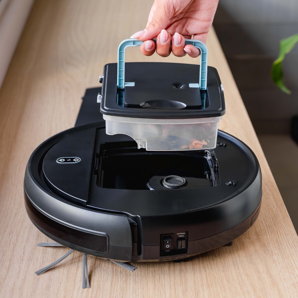 - 3 em 1, o robô varre, aspira e passa pano ao mesmo tempo.