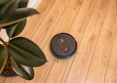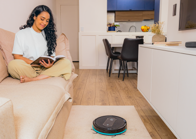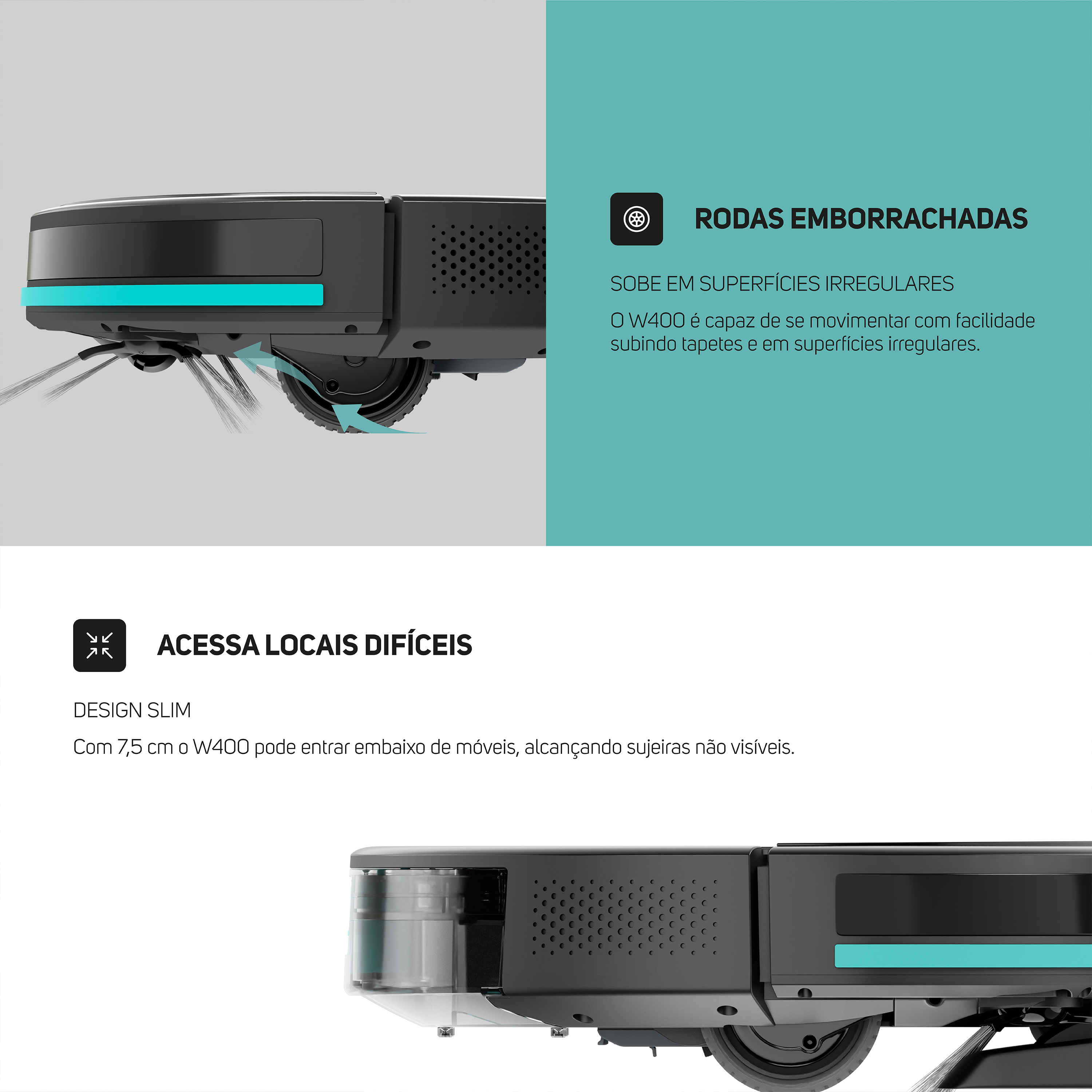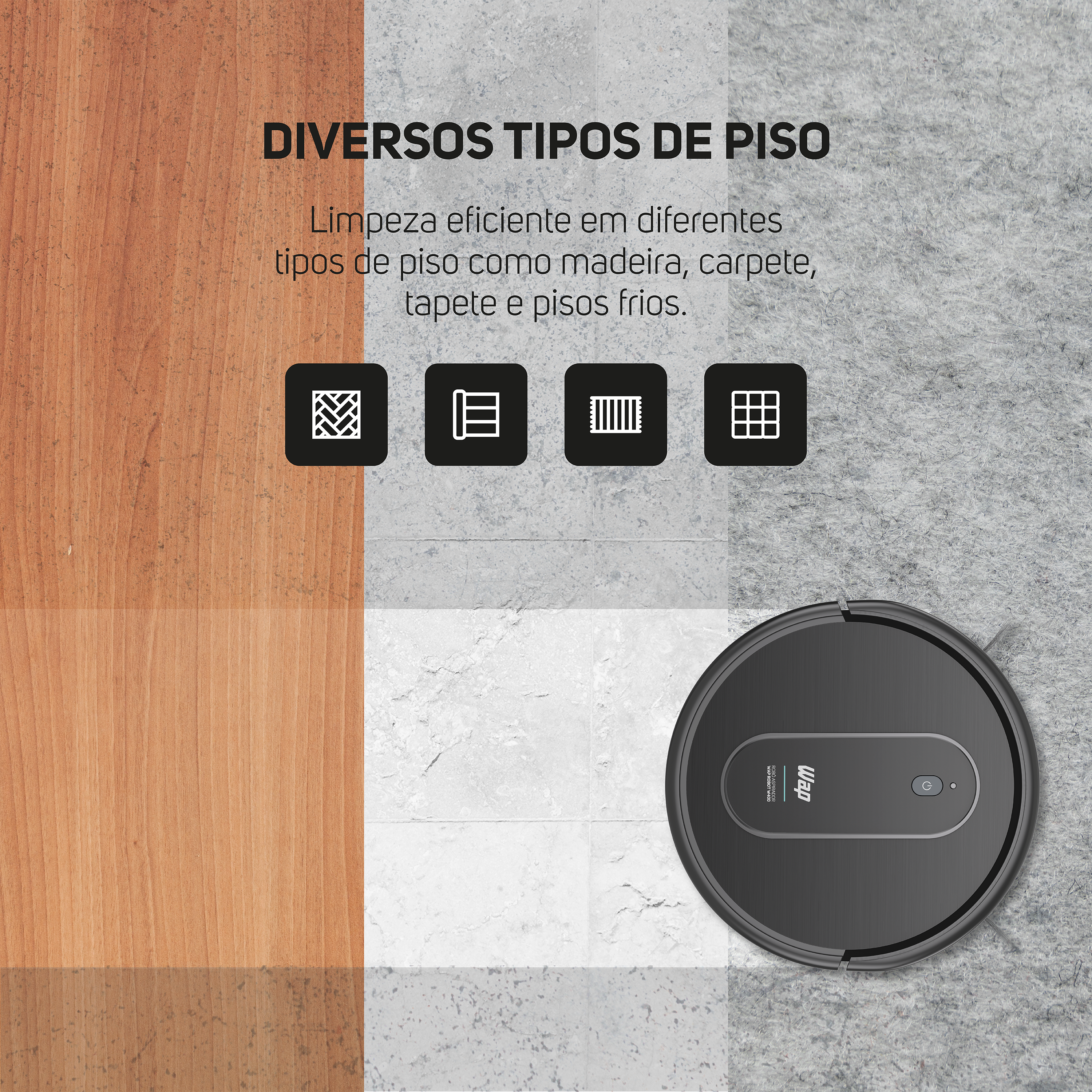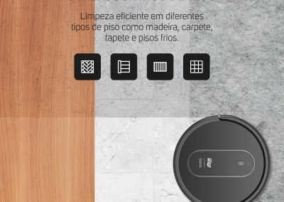 Com o Aspirador Robô W400 você pode limpar vários tipos de piso, como madeira, tapetes, carpetes e pisos frios. E ainda conta com rodinhas emborrachadas e sobe em superfícies irregulares, garantindo que vários lugares sejam alcançados.