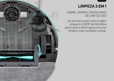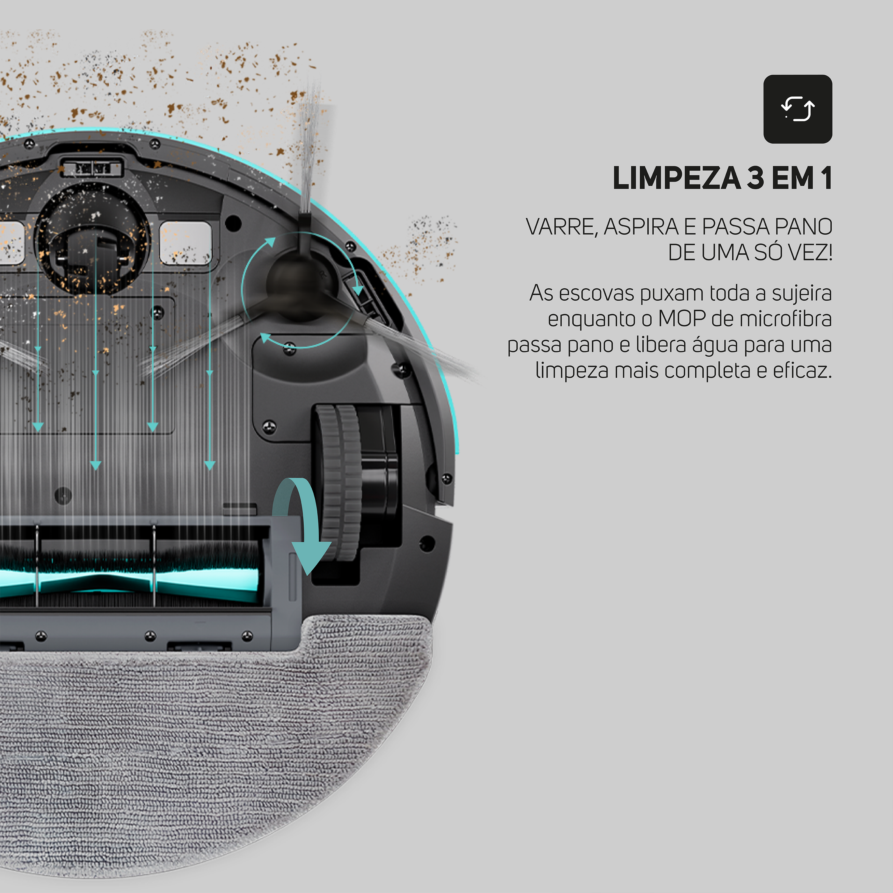 - Mais eficiência na limpeza com duas escovas giratórias laterais e uma escova rotativa central.