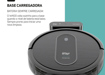 Depois da limpeza, o Robô Aspirador WAP ROBOT W400 volta sozinho para a base e carrega a bateria, ficando pronto para o próximo trabalho. A bateria tem uma durabilidade significativa, chegando até 1h40* de autonomia, o que permite que ele seja capaz de realizar a limpeza completa da casa.