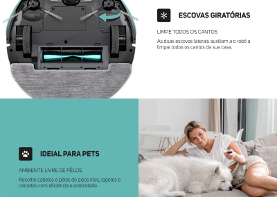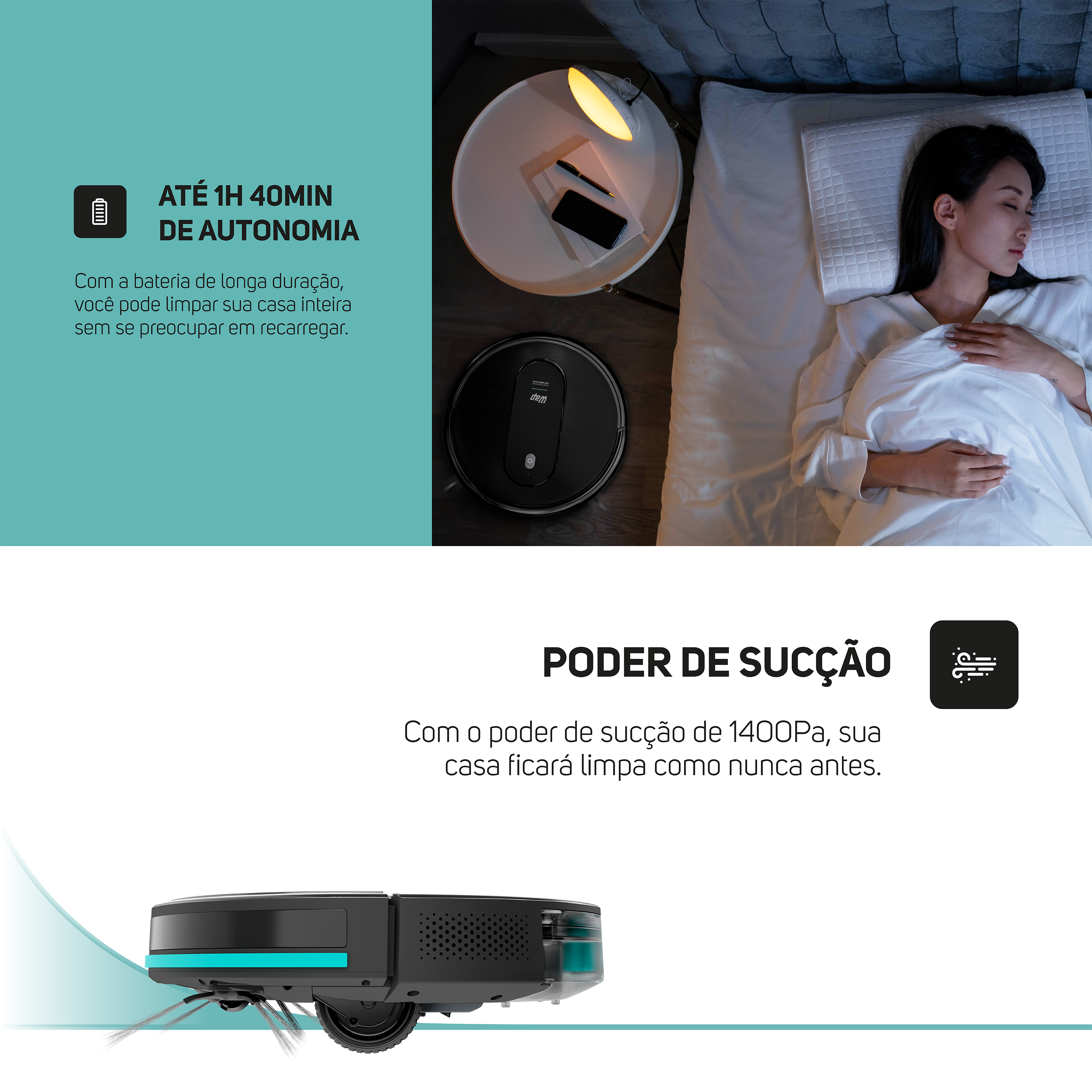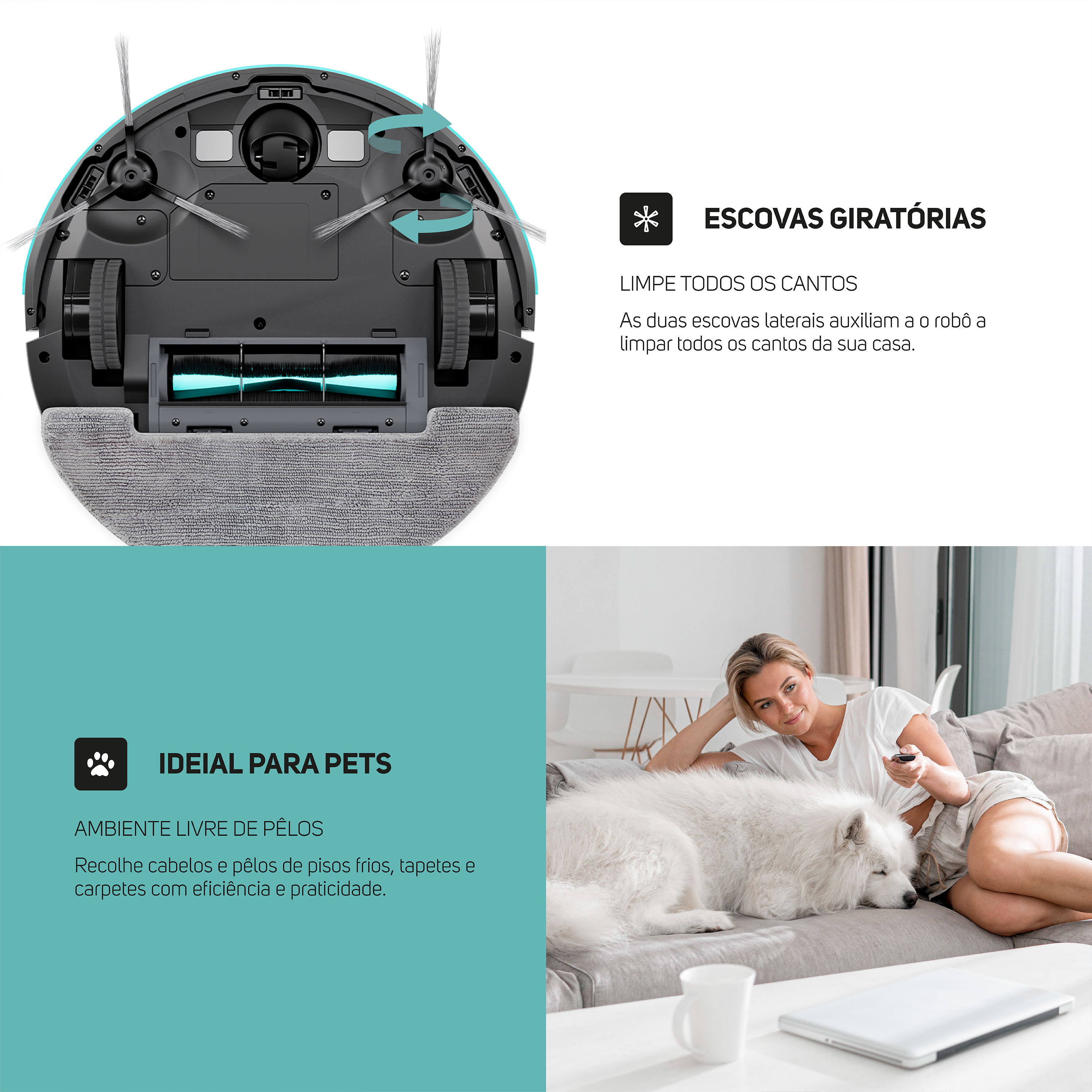 - Possui controle remoto com instruções e retorna automaticamente para a base de recarga quando a bateria está baixa.