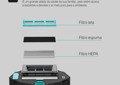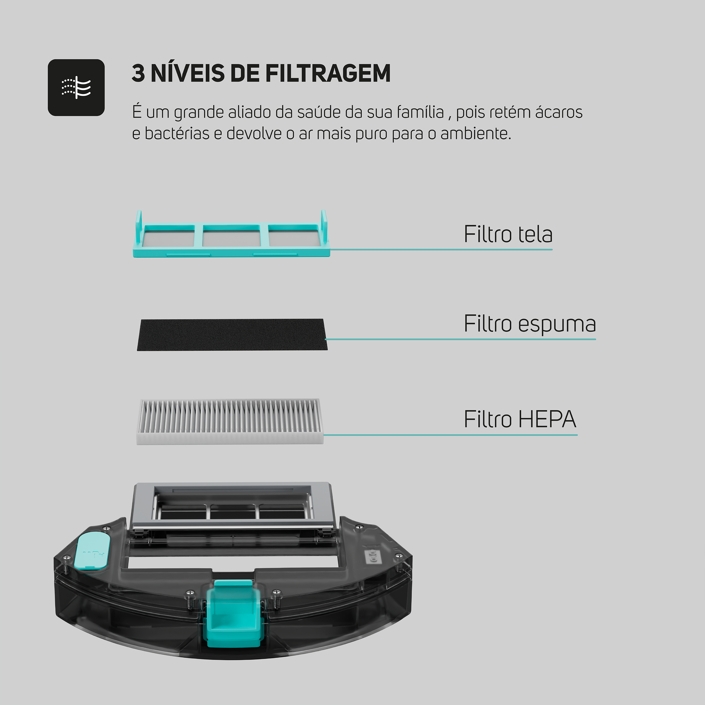 - 3 níveis de filtragem com filtro HEPA, filtro Espuma e filtro Tela. Retém ácaros e bactérias e devolve o ar mais puro para o ambiente.