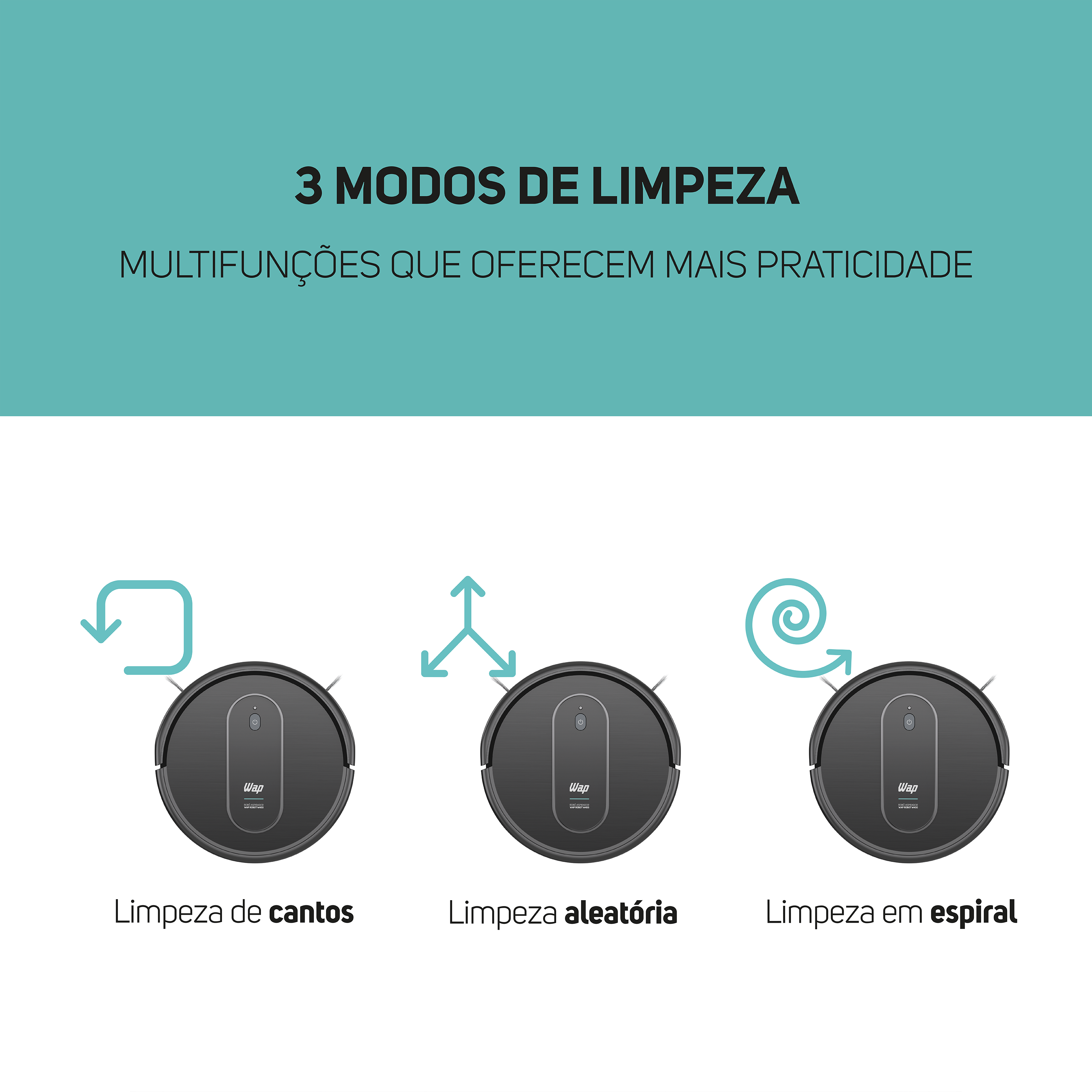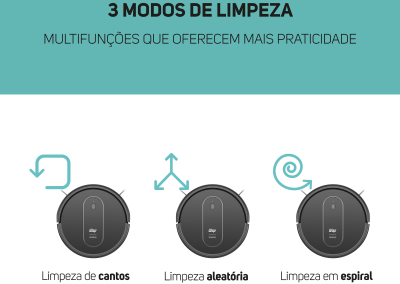 - 3 níveis de Sucção e 3 modos de limpeza que incluem: Limpeza de cantos, Limpeza aleatória e Limpeza em espiral.