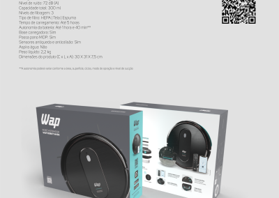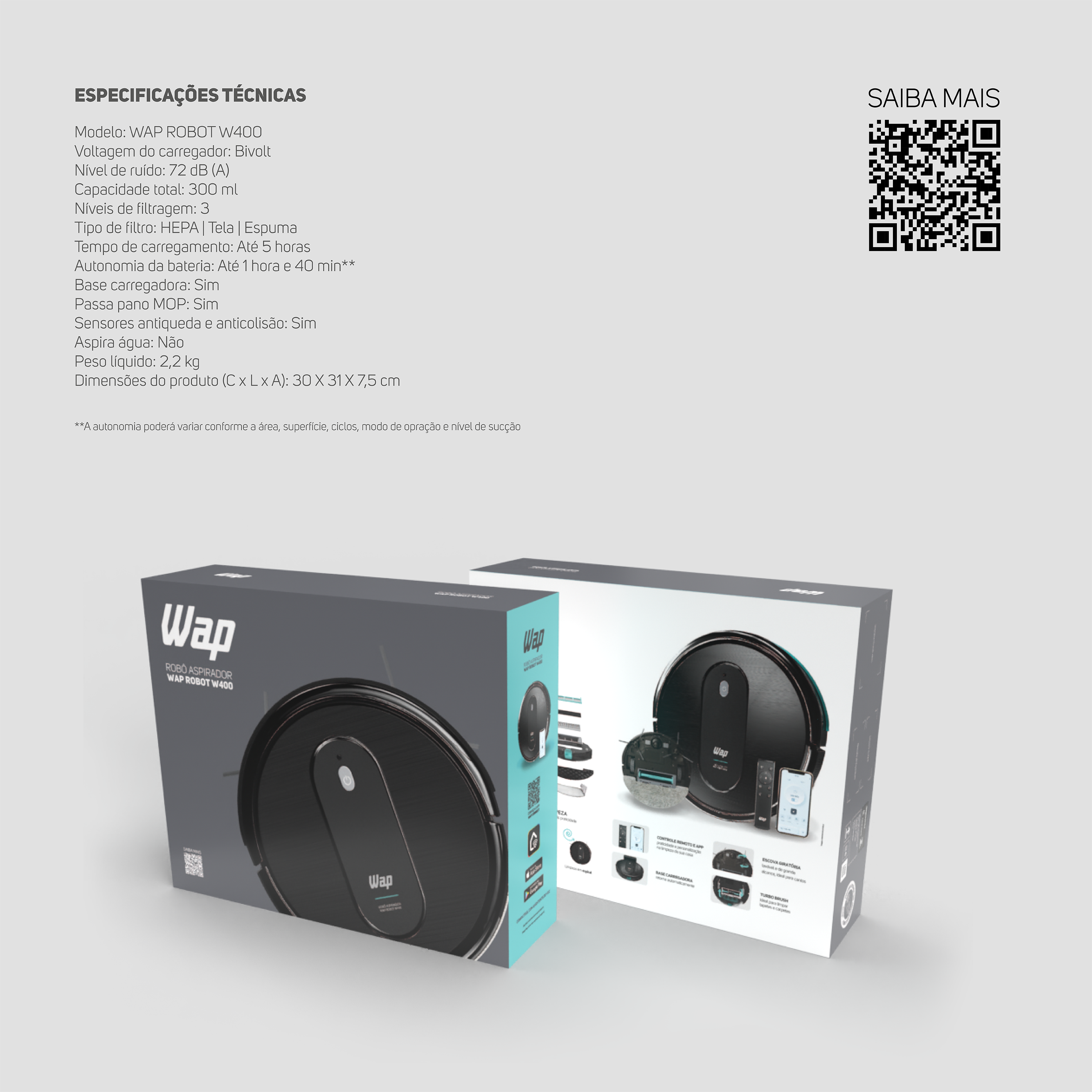 | CONTEÚDO DA EMBALAGEM: | Robô Aspirador WAP ROBOT W400, Controle Remoto, 1 Base para MOP, 2 MOPS em microfibra, Base de Carregamento, 4 Escovas Giratórias, 1 Adaptador Carregador, 2 Pilhas AAA, 1 Filtro HEPA extra, 1 Escova com lâmina de limpeza, Manual de Instruções. |