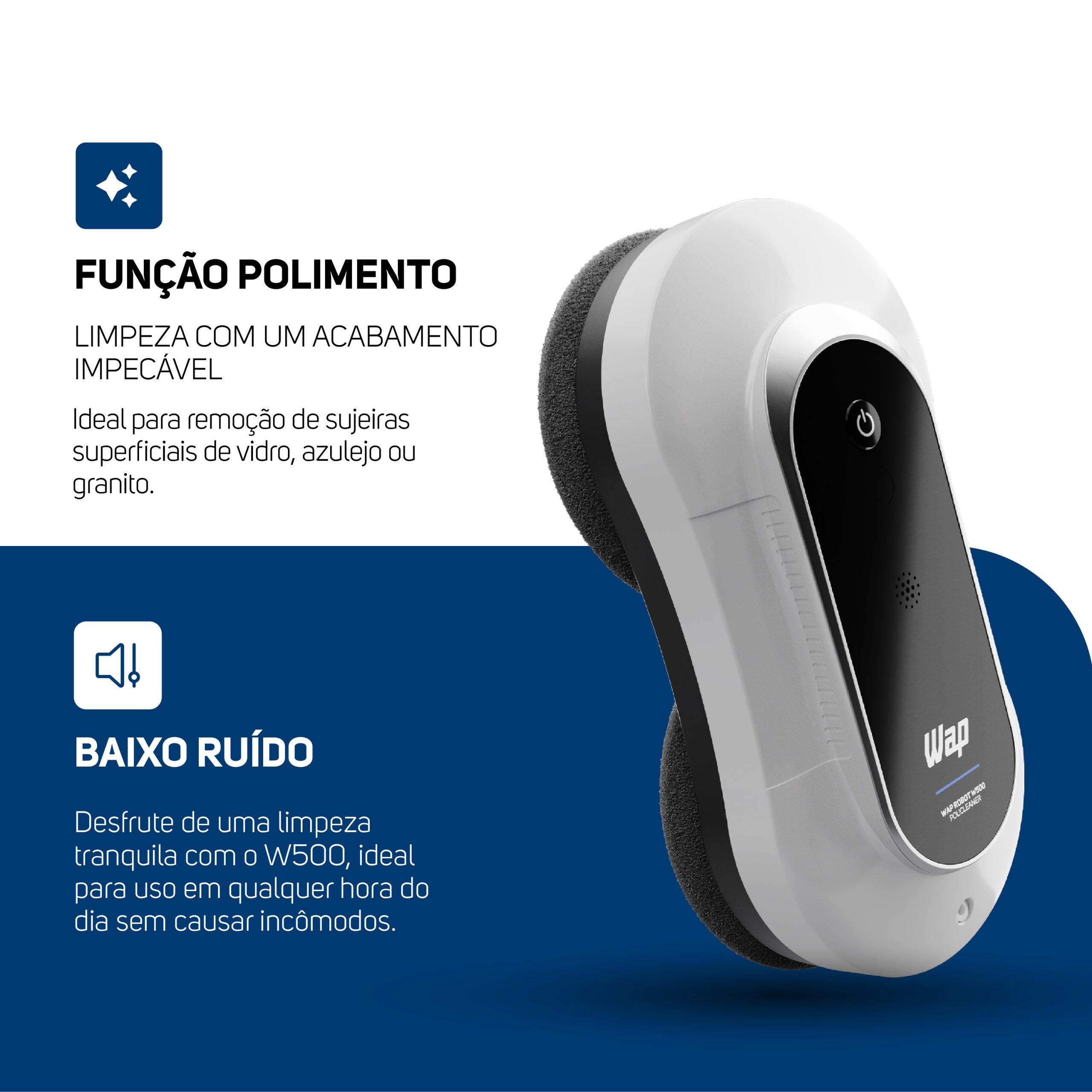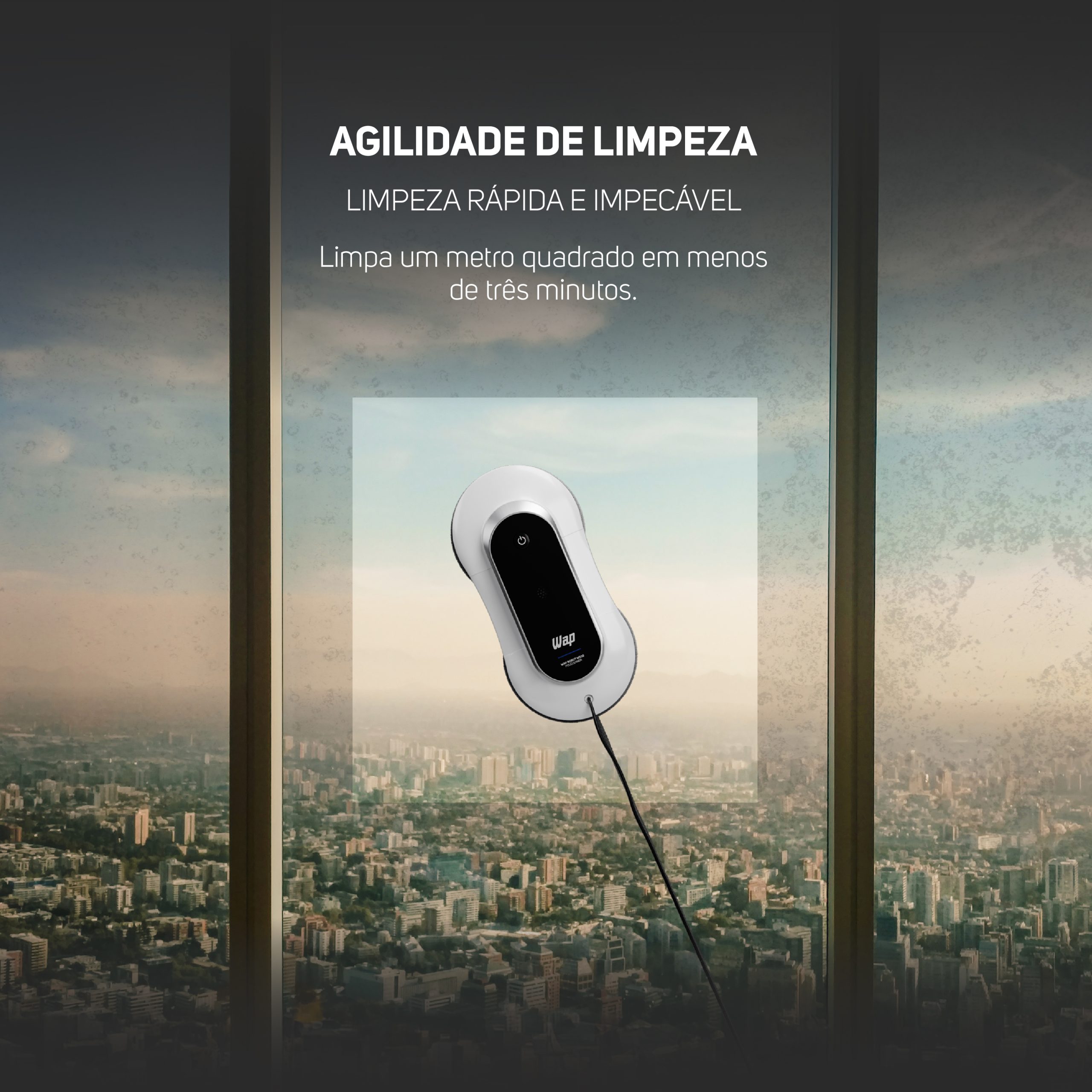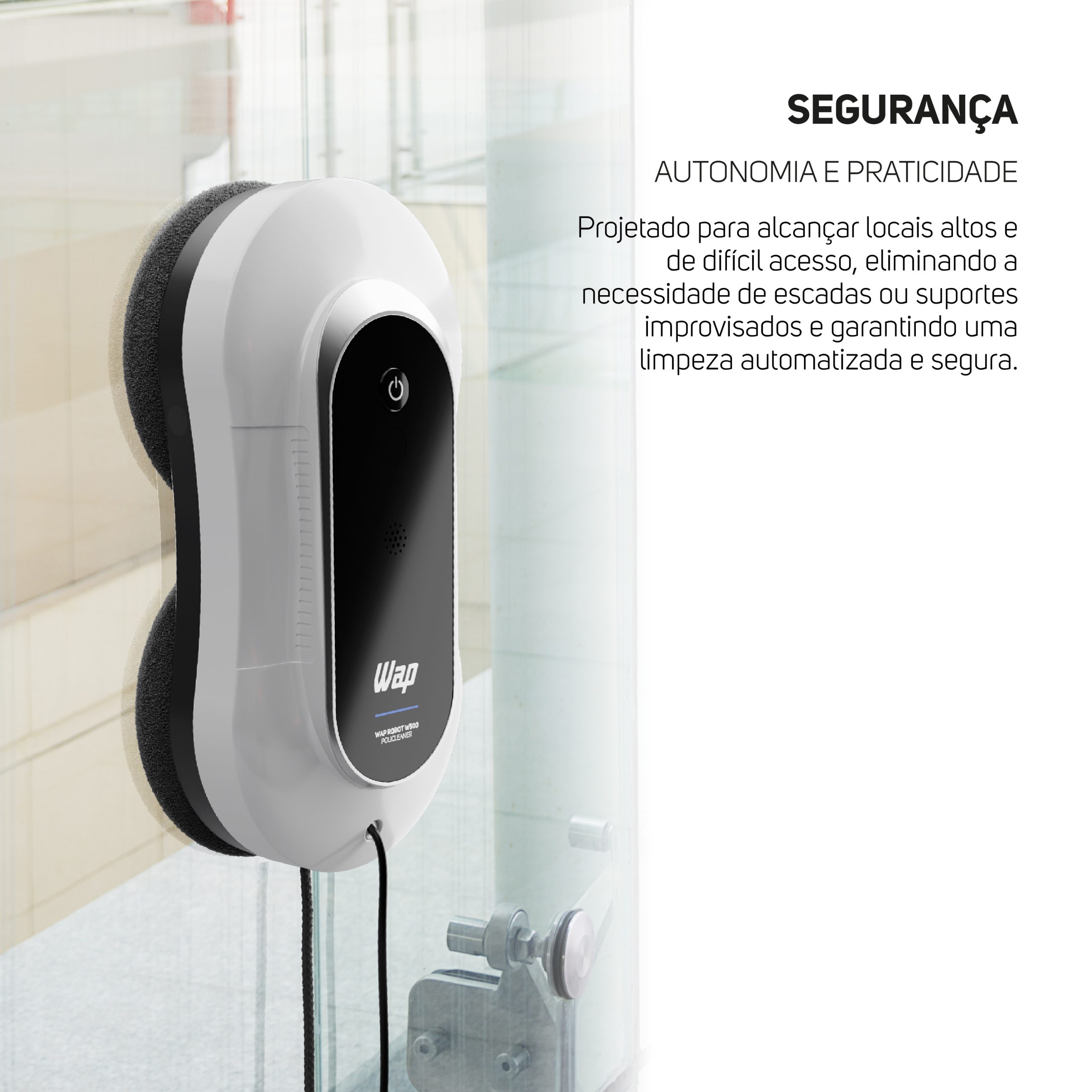 Aposte em inovação e praticidade para limpar vidros e janelas! O Robô de Limpeza WAP ROBOT W500 POLICLEANER oferece autonomia total e segurança, alcançando os lugares mais altos e difíceis, transformando sua rotina com mais liberdade.