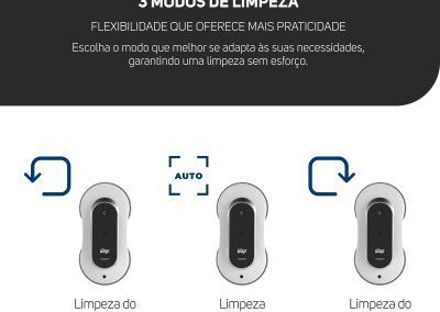 Ajuste o funcionamento sem interrupção de suas atividades, selecionando entre os três modos de limpeza - canto esquerdo, automática e canto direito – ou defina a trajetória de maneira prática pelo controle remoto. O robô é equipado com cabos que oferecem máxima praticidade: o cabo de força com 17 cm e o cabo da fonte de 194,5 cm garantem facilidade no uso.