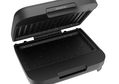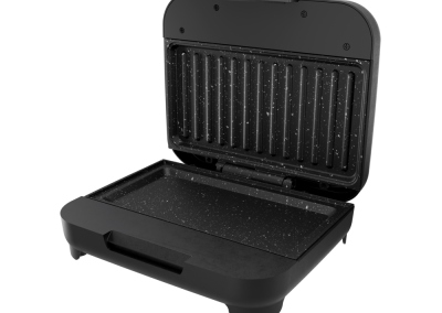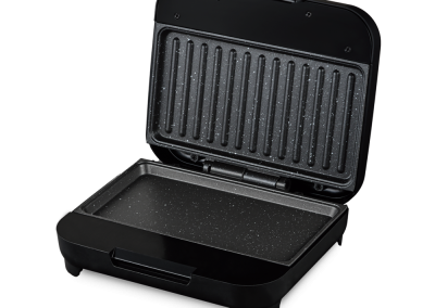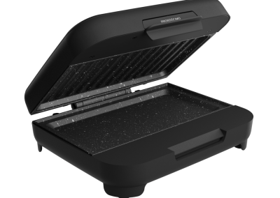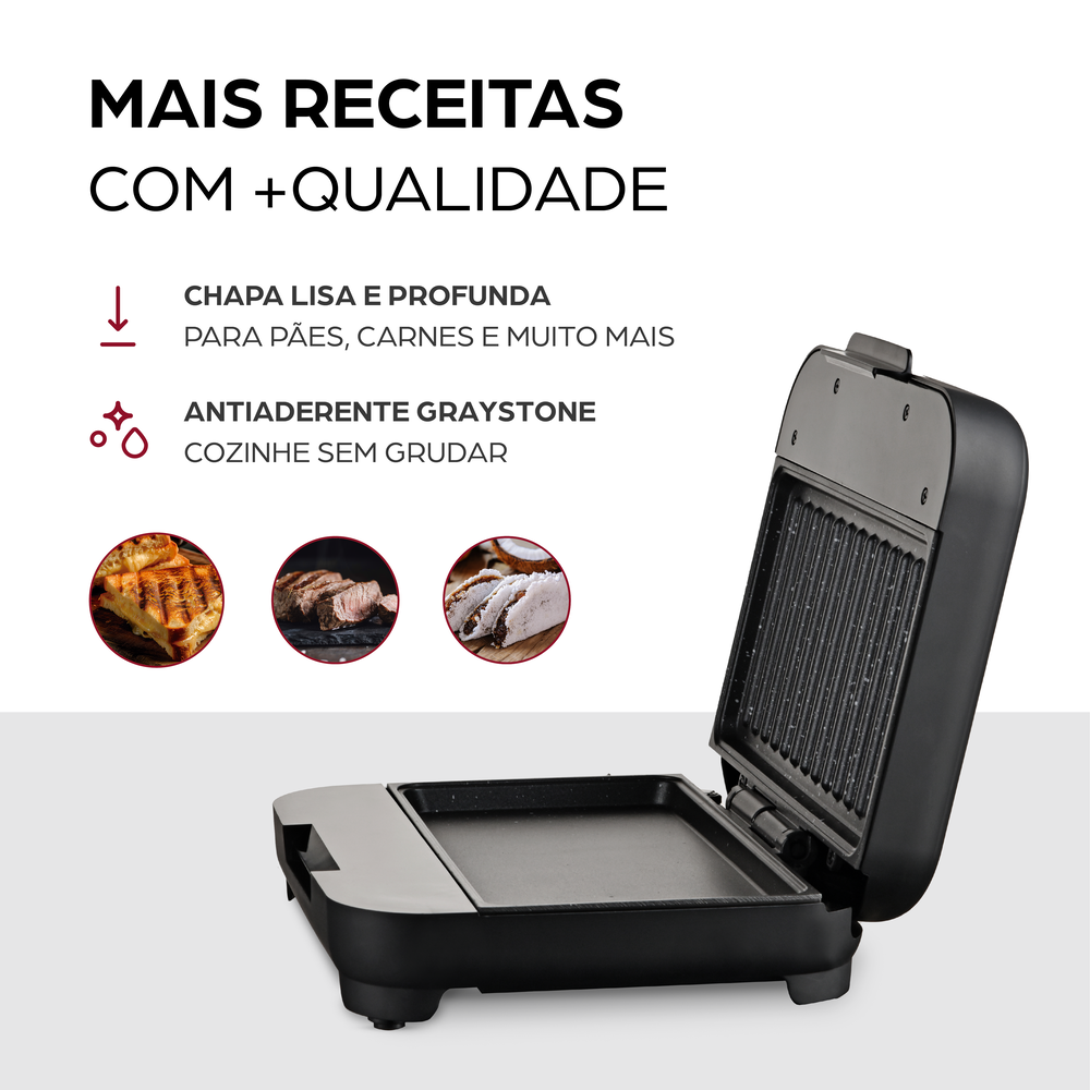 Muito além dos lanches rápidos, a SANDUICHEIRA CLICK GRILL WSC750 é versátil e espaçosa. Com uma chapa grill e outra chapa lisa, mais profunda, ela prepara desde carnes e ovos até tapiocas e legumes. Seu revestimento antiaderente Graystone evita que os alimentos grudem, o que facilita a limpeza.