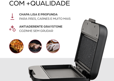 - Potência de 750W que garante grelhados no ponto certo.