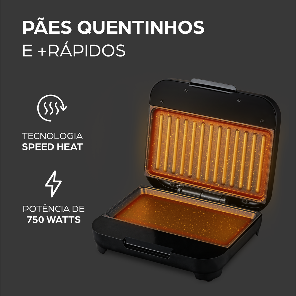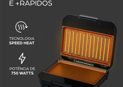 A potência de 750W oferece excelente desempenho, principalmente para quem busca praticidade e economia. Pronta para uso em segundos, a Speed Heat Technology faz com que a sanduicheira grill atinja a temperatura ideal em instantes, sem abrir mão do sabor.