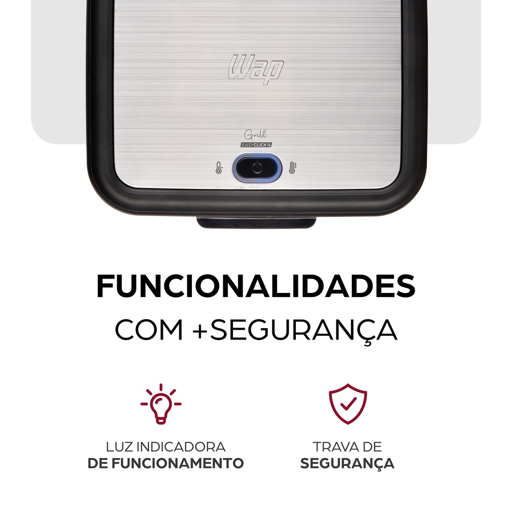 - Luz indicadora de funcionamento mostra exatamente quando a sanduicheira WAP está pronta para uso.