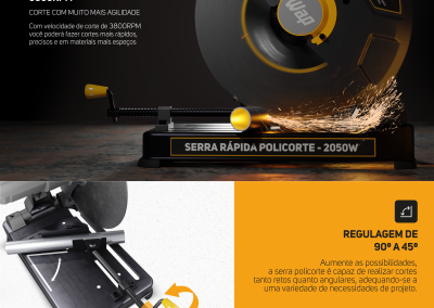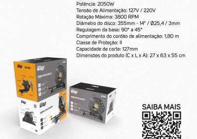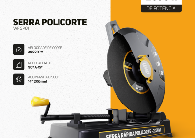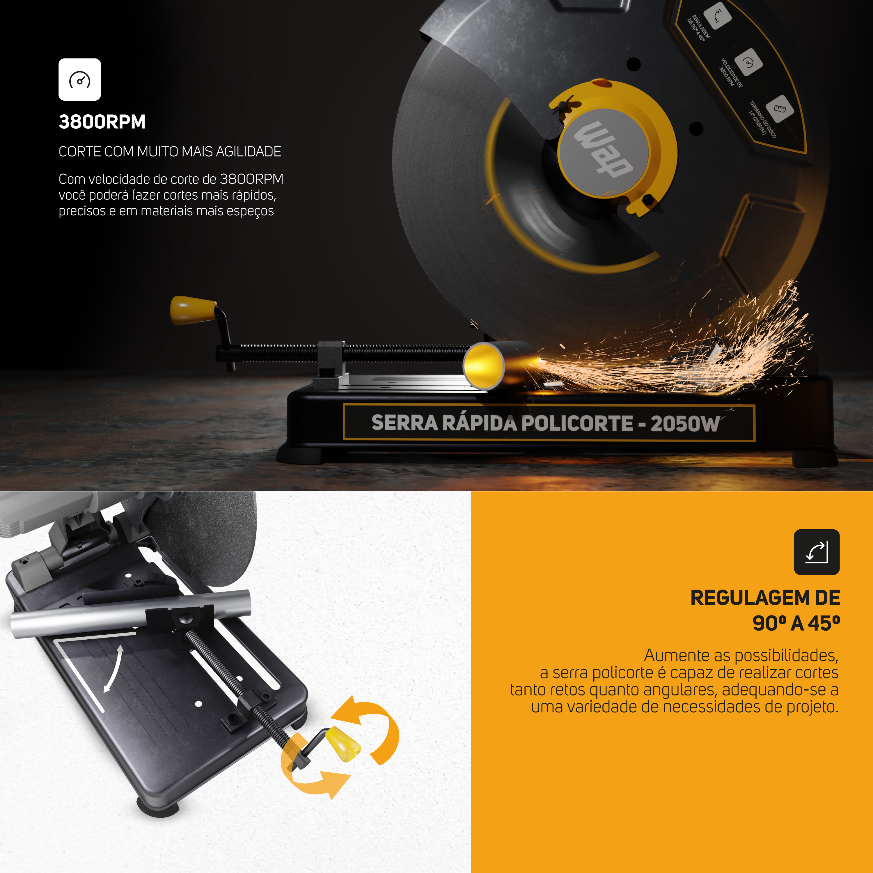 Composta por um disco de corte rotativo 14” (355mm) e velocidade de até 3800 RPM, a Serra Policorte WAP WF SP01 á a melhor escolha para proporcionar cortes precisos e ágeis em uma variedade de tarefas.