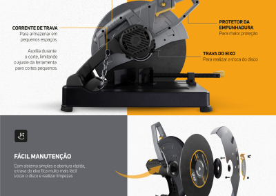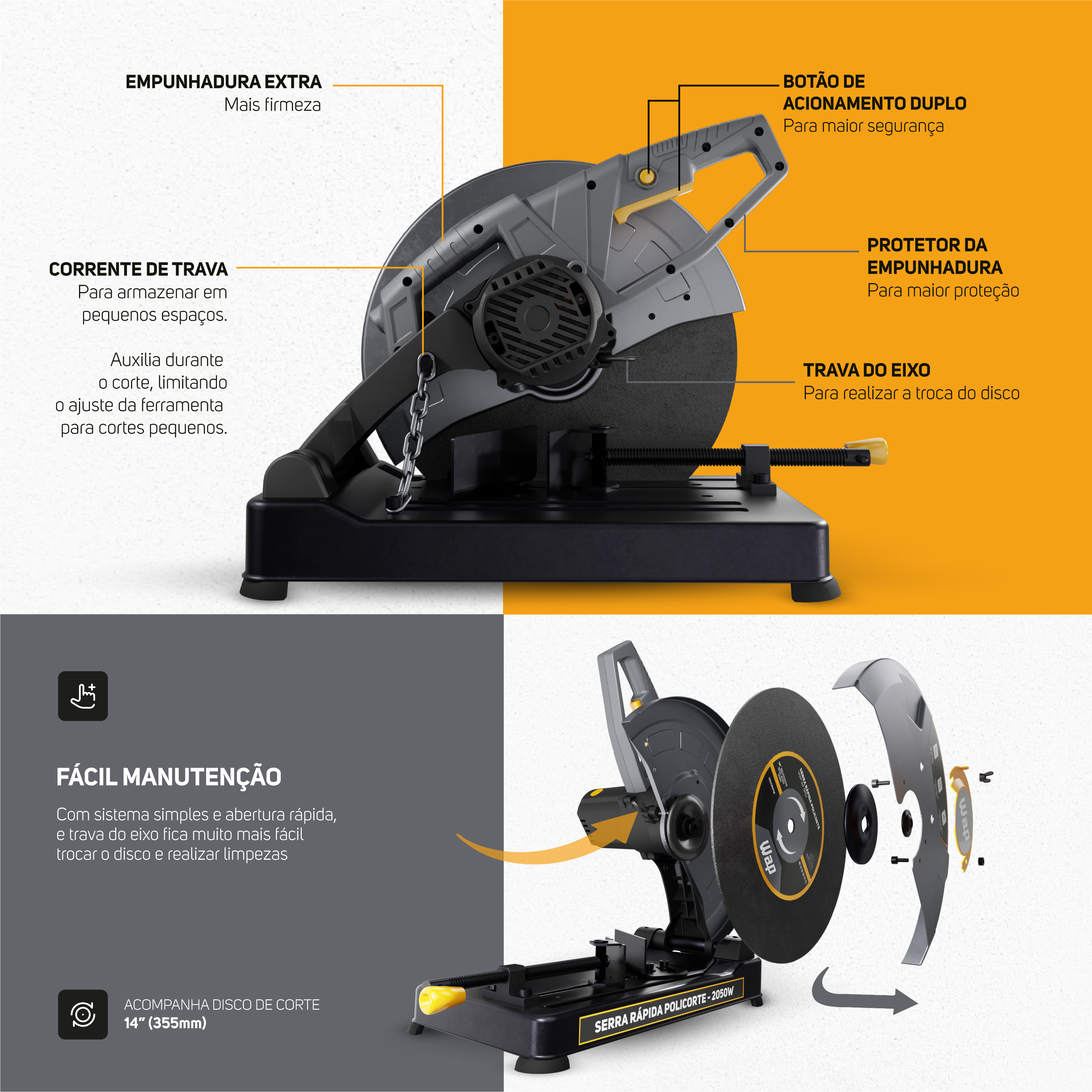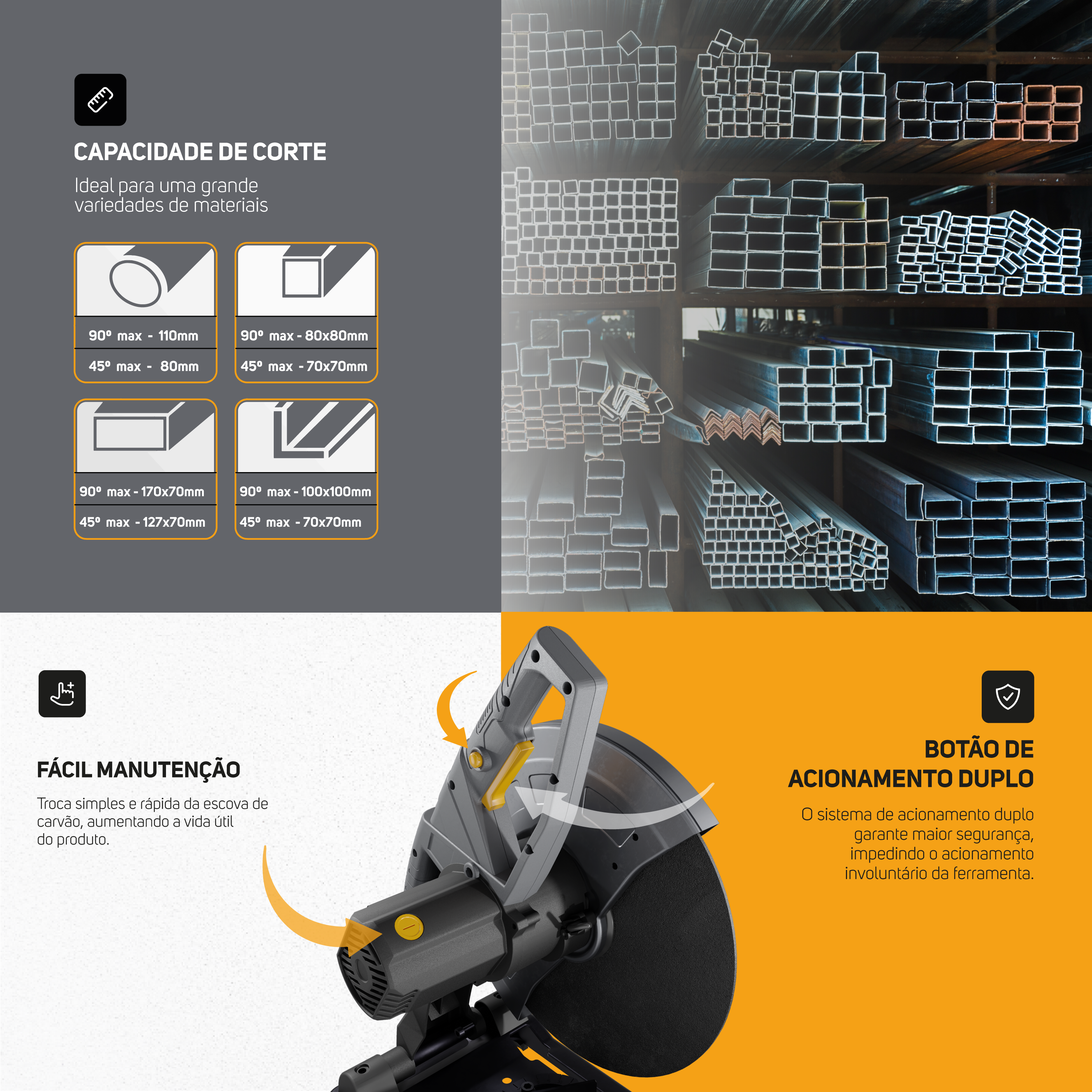 - Equipada com um disco de corte de 14” (355mm), seus cortes são rápidos e precisos do início ao fim.